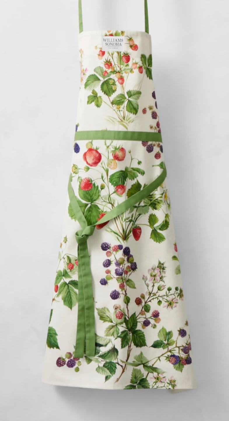I'm selling a Williams Sonoma apron with a holiday botanical design. It's in new condition. This beautiful apron features a festive pattern of pine branches, berries, and pinecones. Perfect for holiday baking and cooking!
