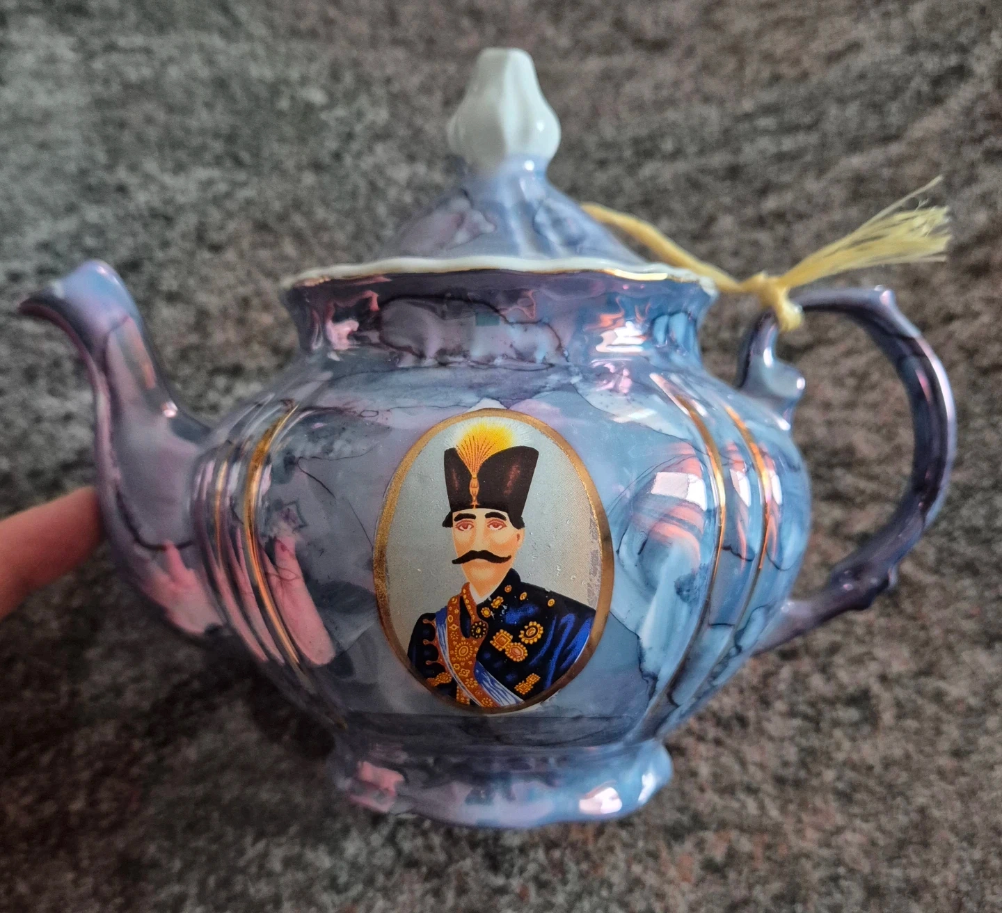 Selling a vintage-style, fine china teapot featuring a unique portrait design. It's in new condition and would make a lovely addition to any collection or a charming piece for your kitchen. The teapot has a beautiful blue and white marbled effect with gold trim.