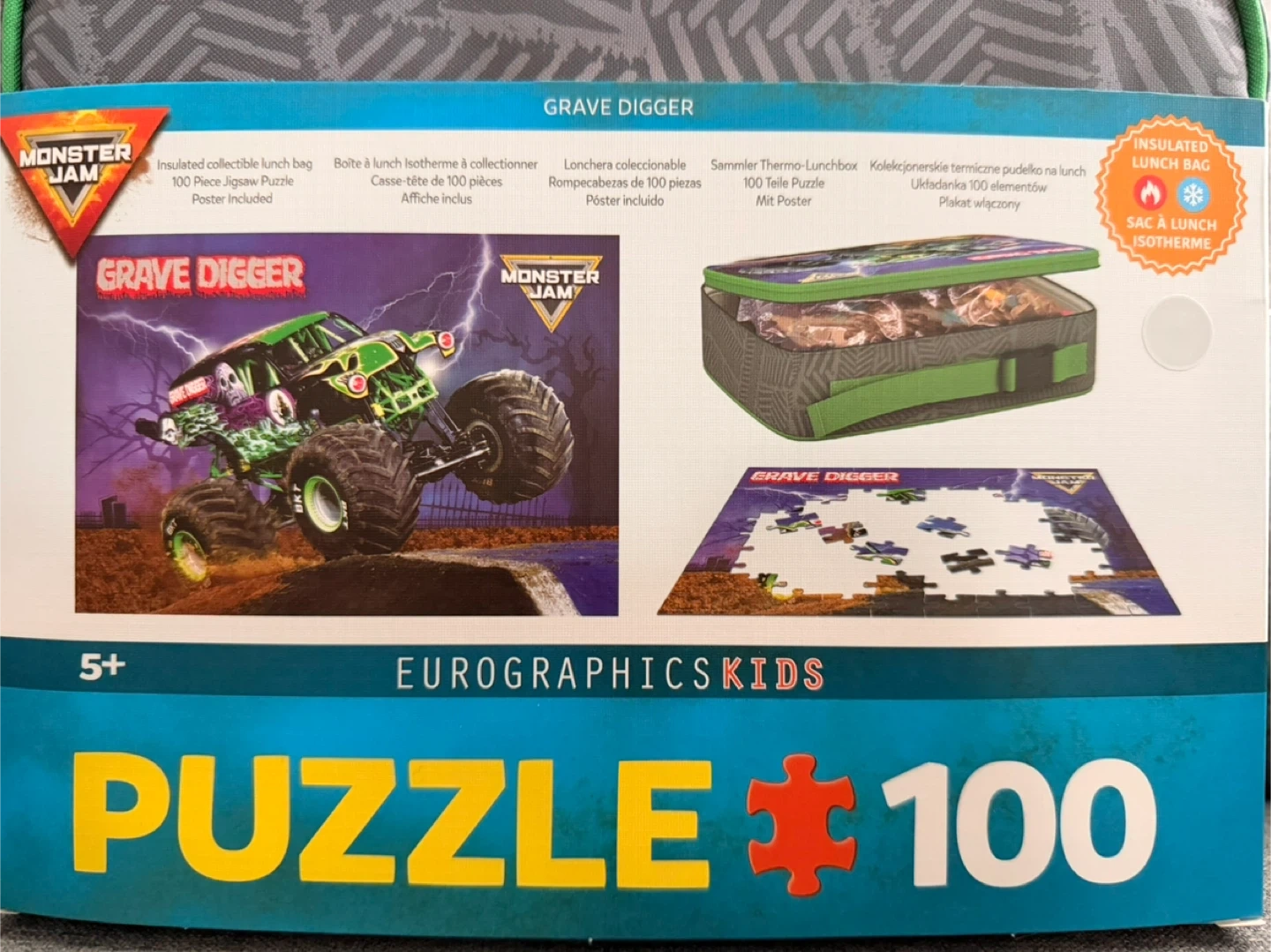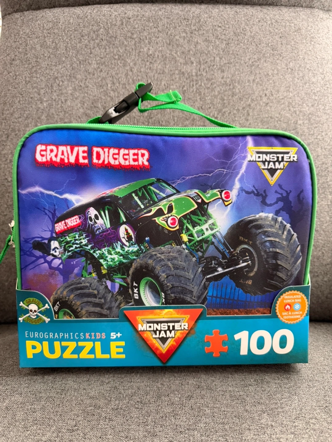 Selling a brand new Monster Jam Grave Digger puzzle that comes with a lunch bag! This is a 100-piece puzzle that also includes a poster. The lunch bag is insulated, making it perfect for keeping snacks cool. Recommended for ages 5+.