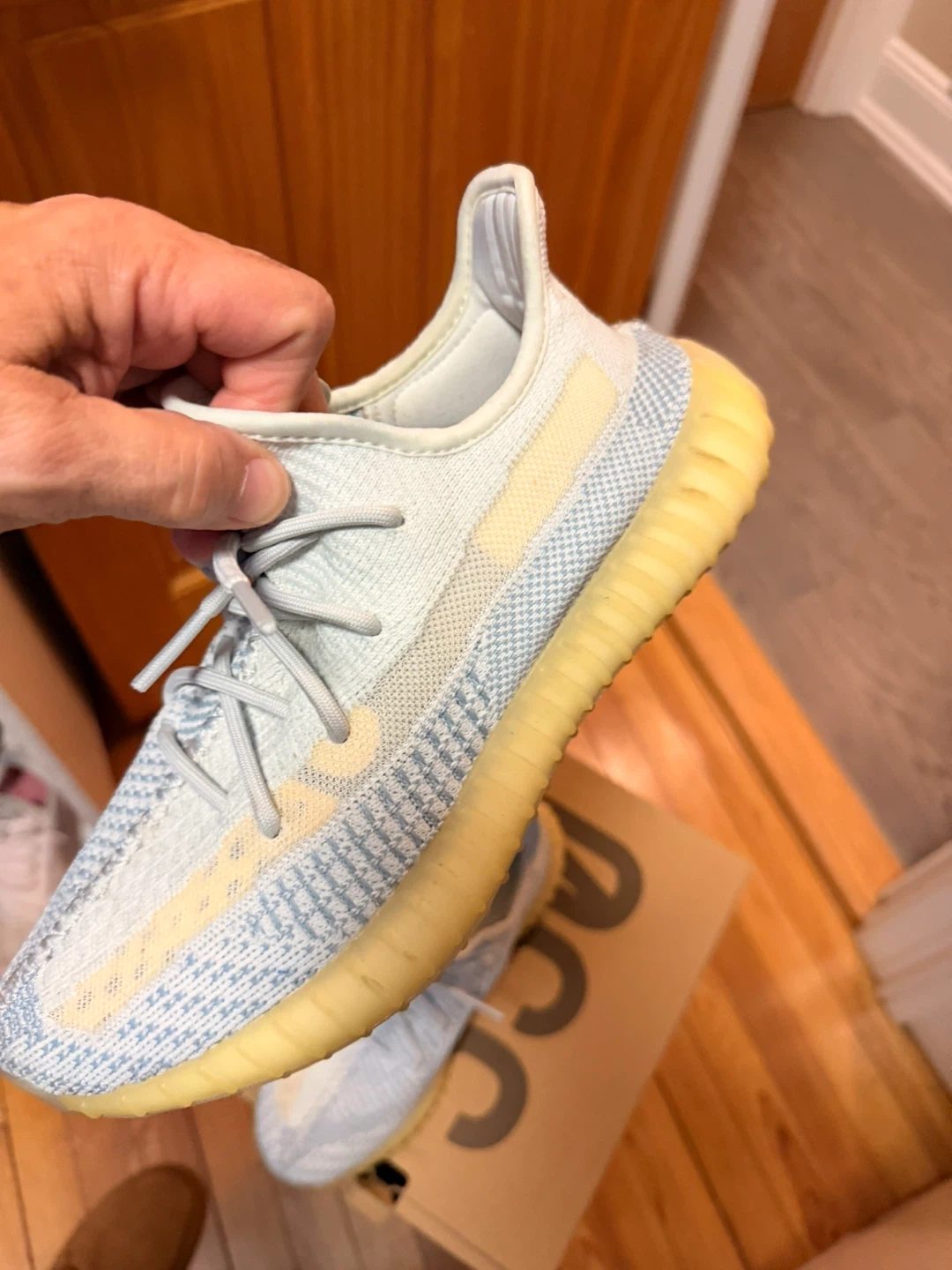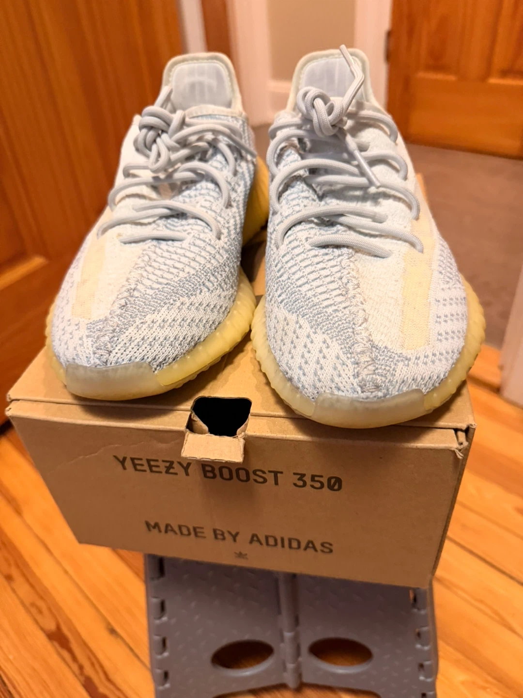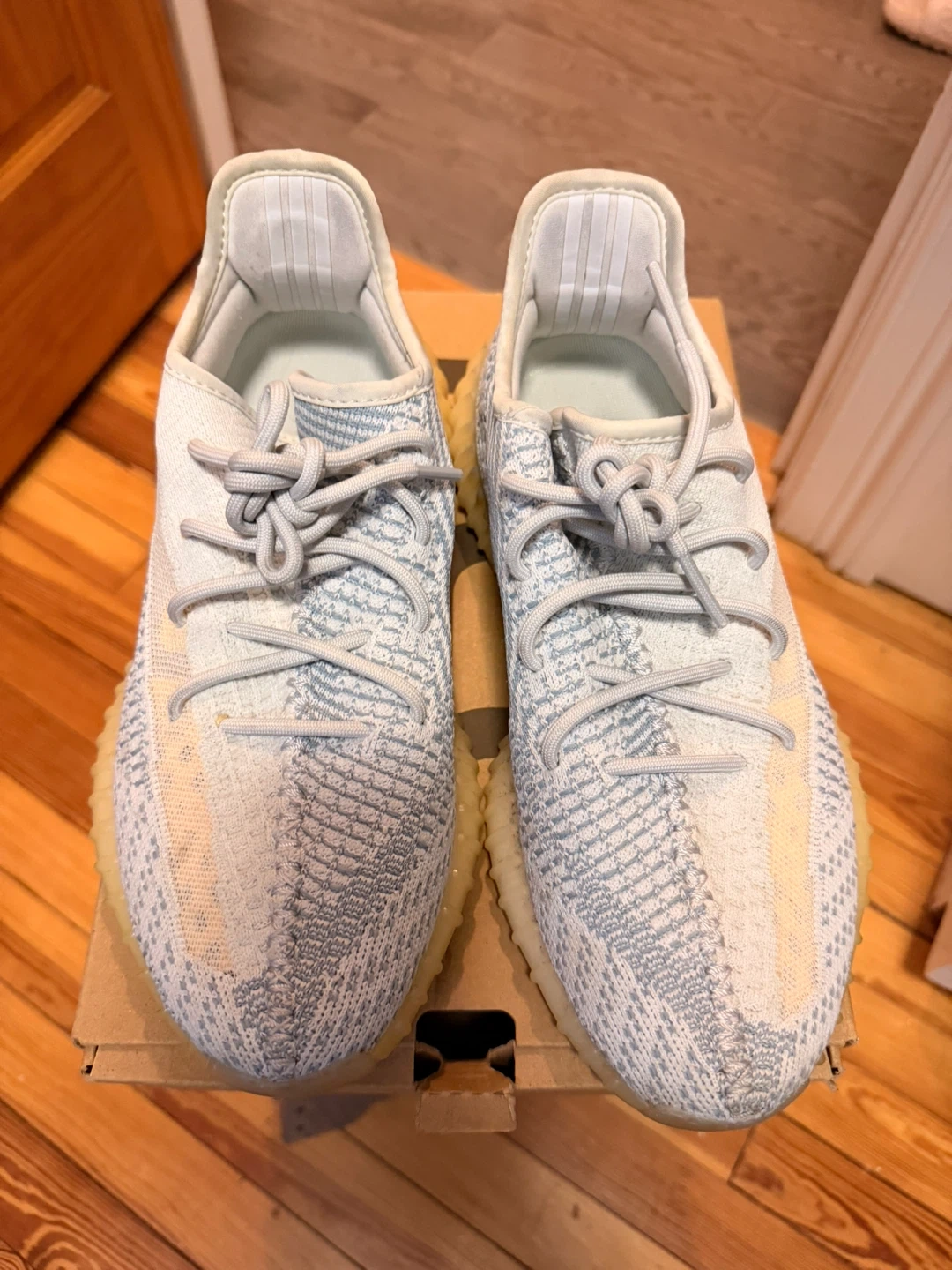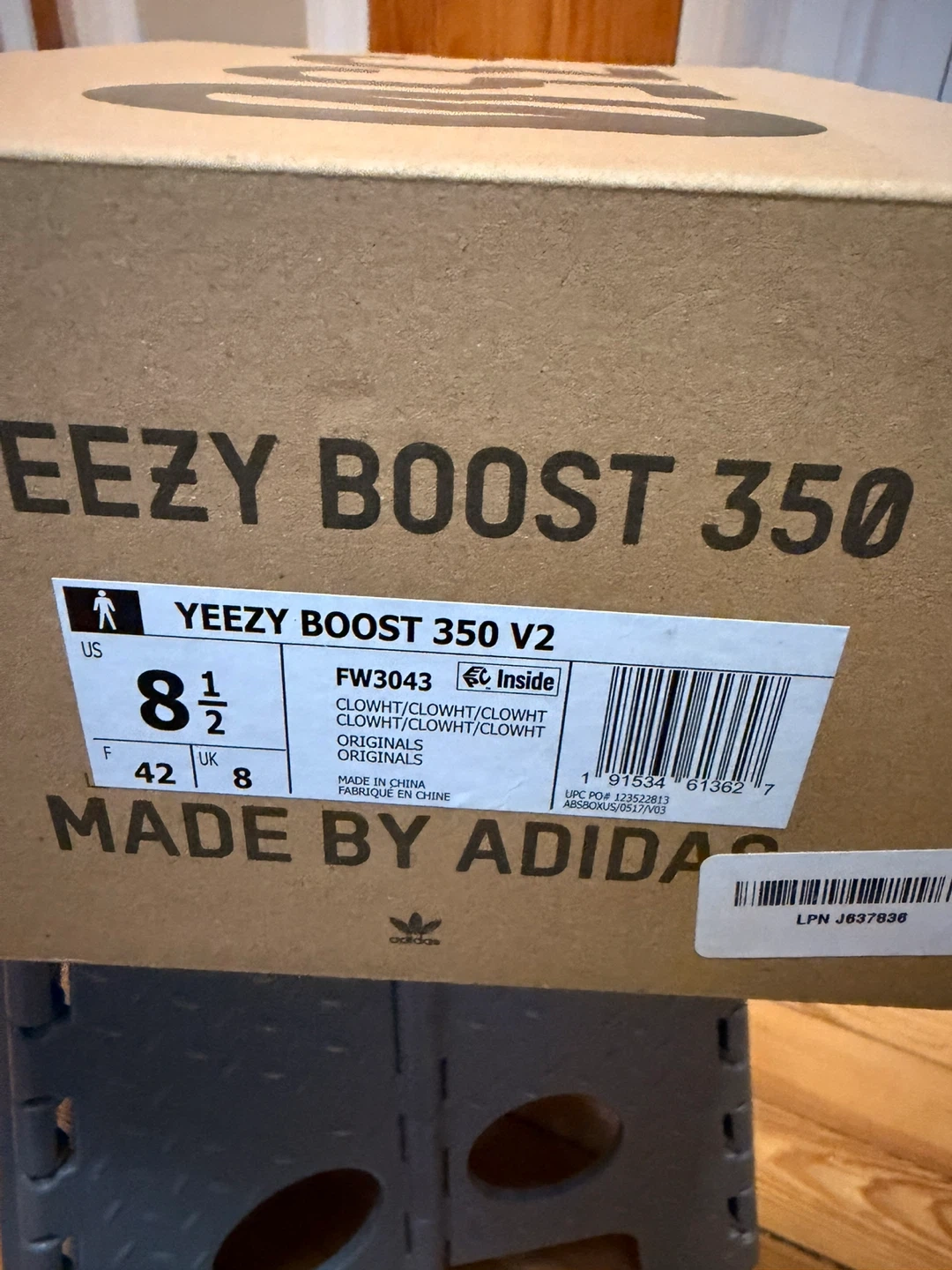 Selling a pair of Adidas Yeezy Boost 350 V2 in the Cloud White colorway. These are a US size 8.5. They come with the original box.