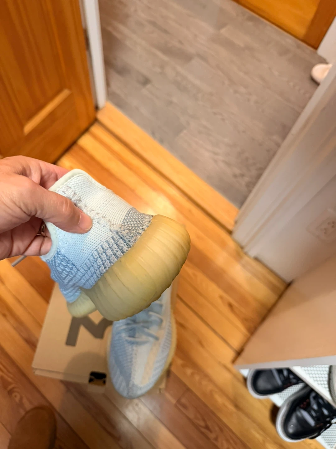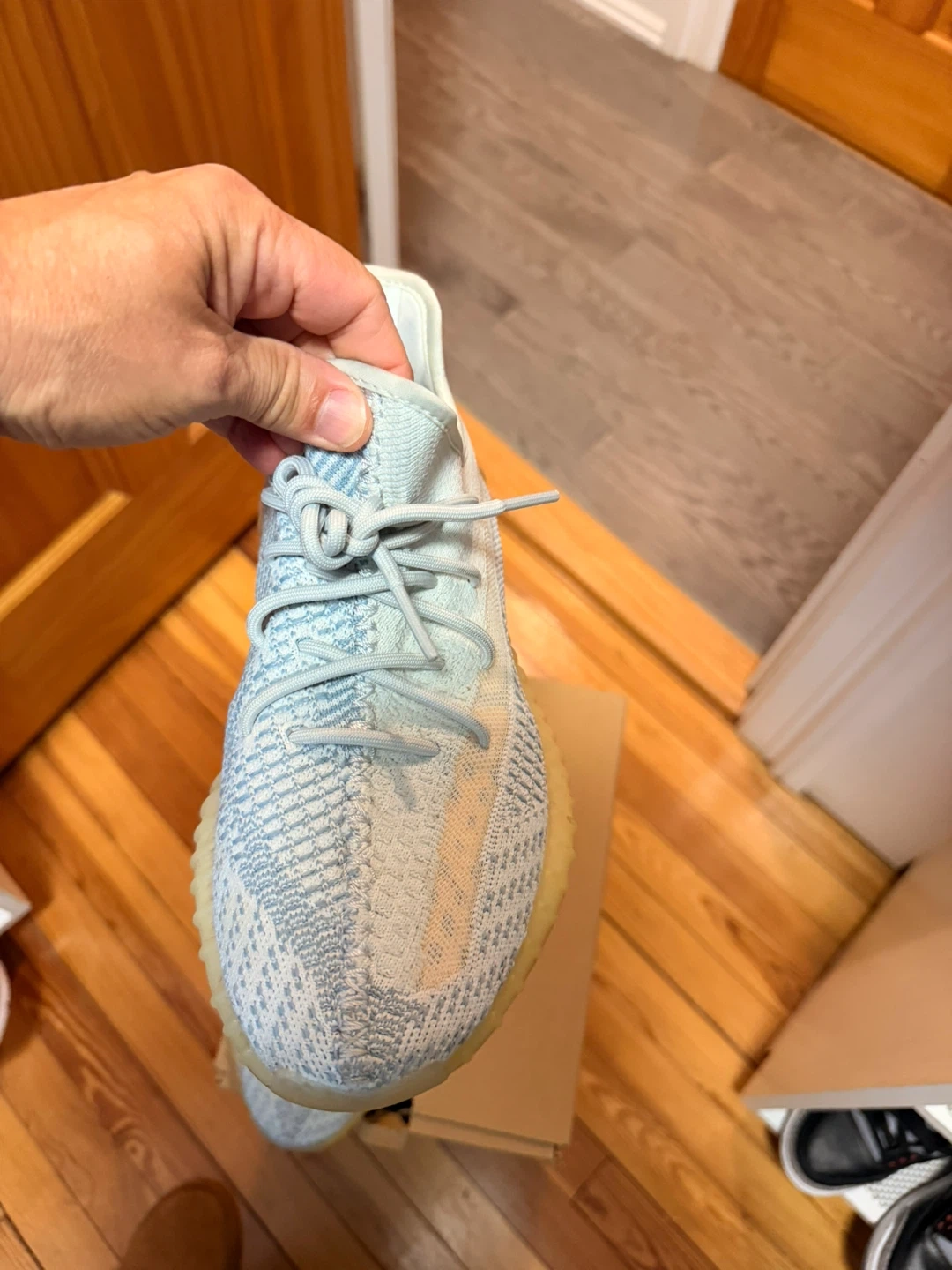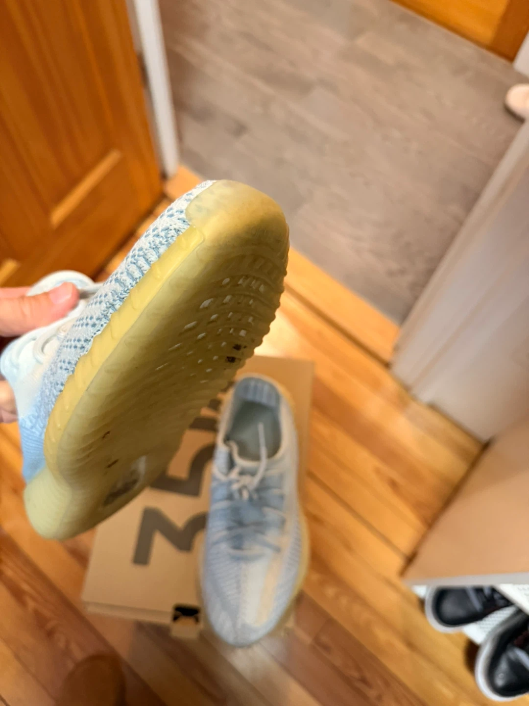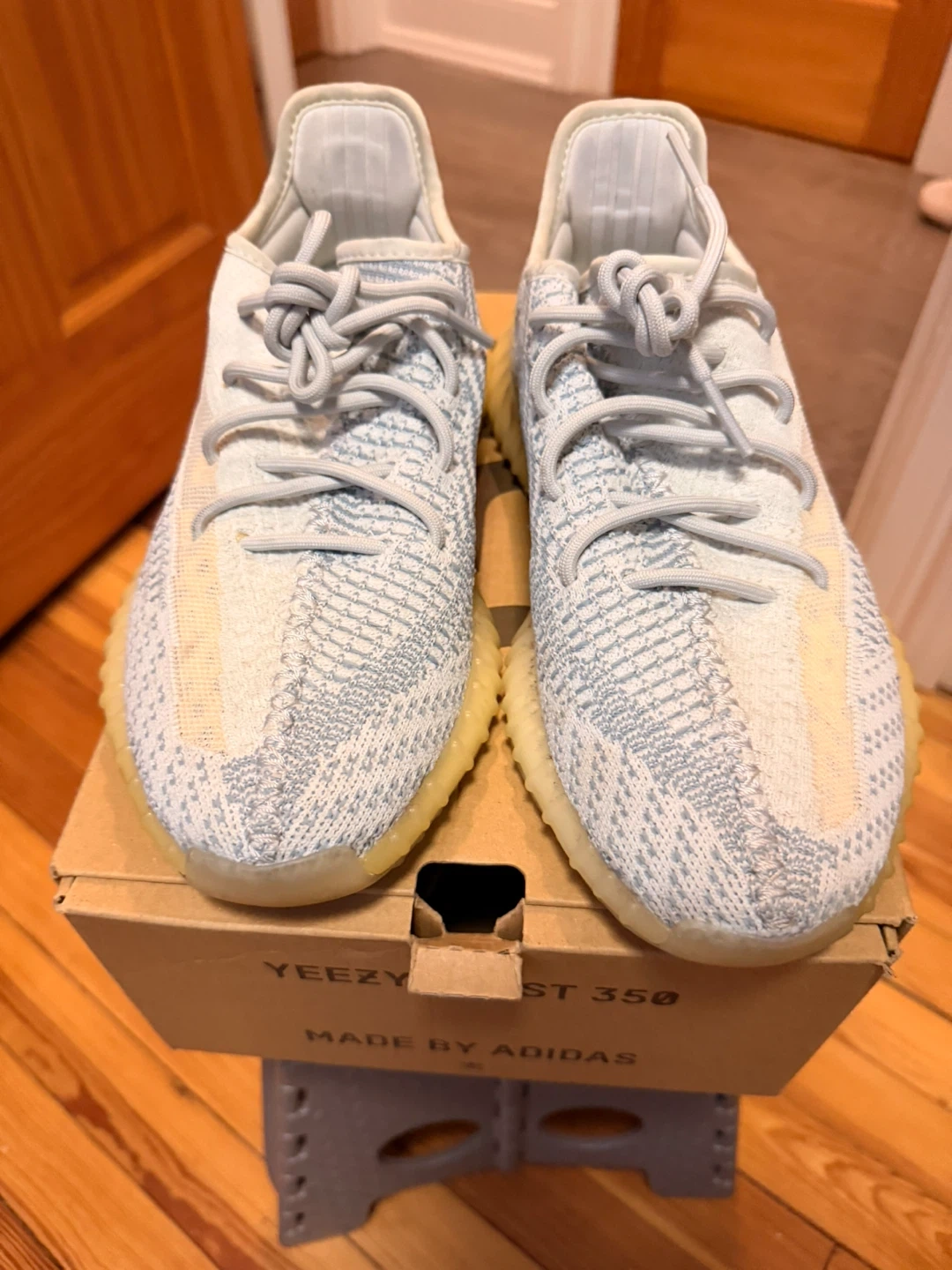 Selling a pair of Adidas Yeezy Boost 350 V2 in the Cloud White colorway. These are a US size 8.5. They come with the original box.