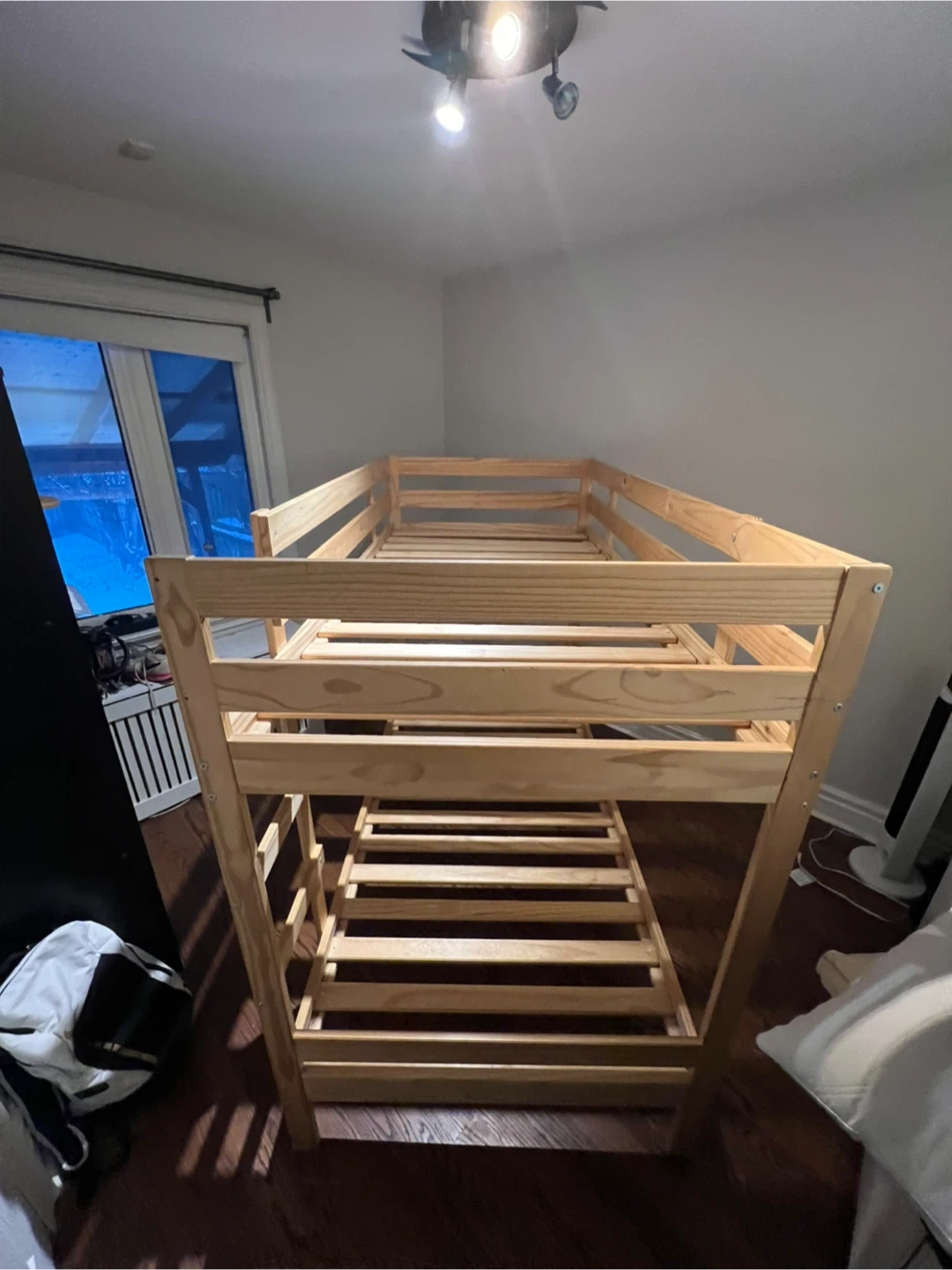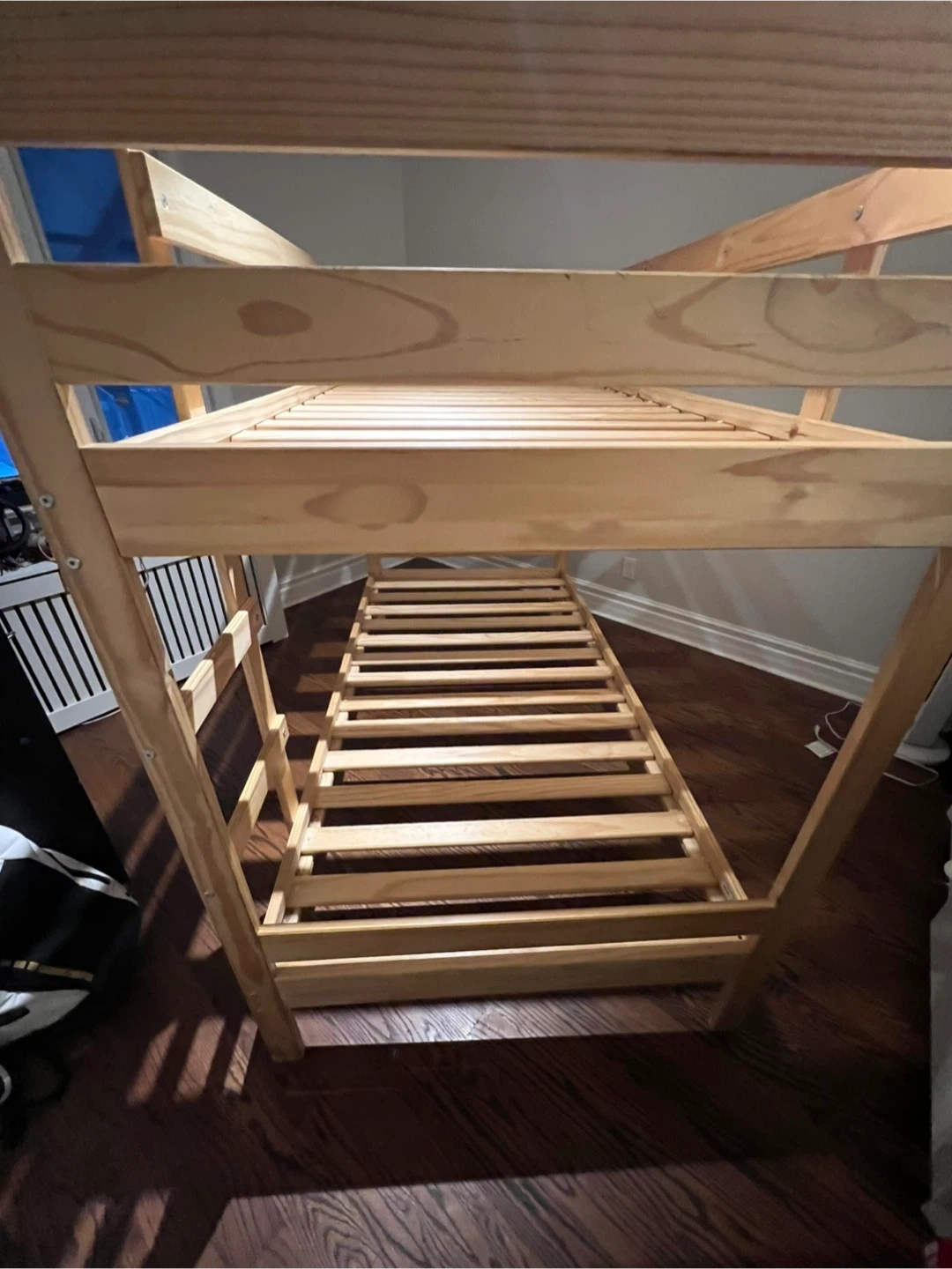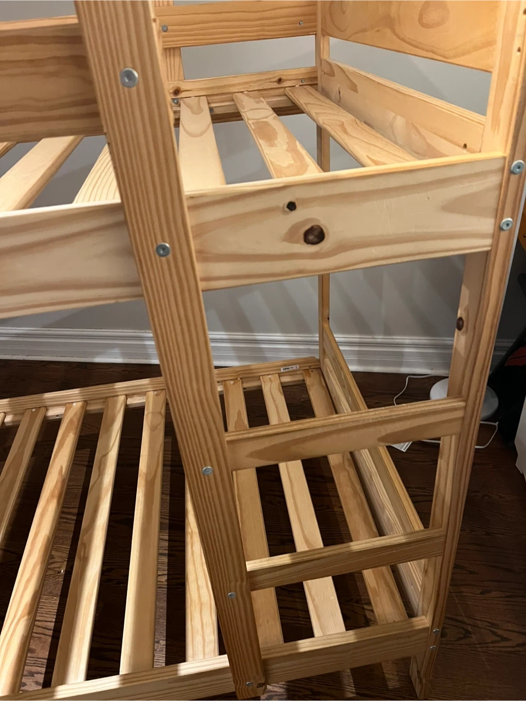 Selling an IKEA bunk bed frame in pine. This is a twin size bed frame. It's a great space-saving solution for kids' rooms or smaller spaces. The frame is in good condition and ready for a new home!