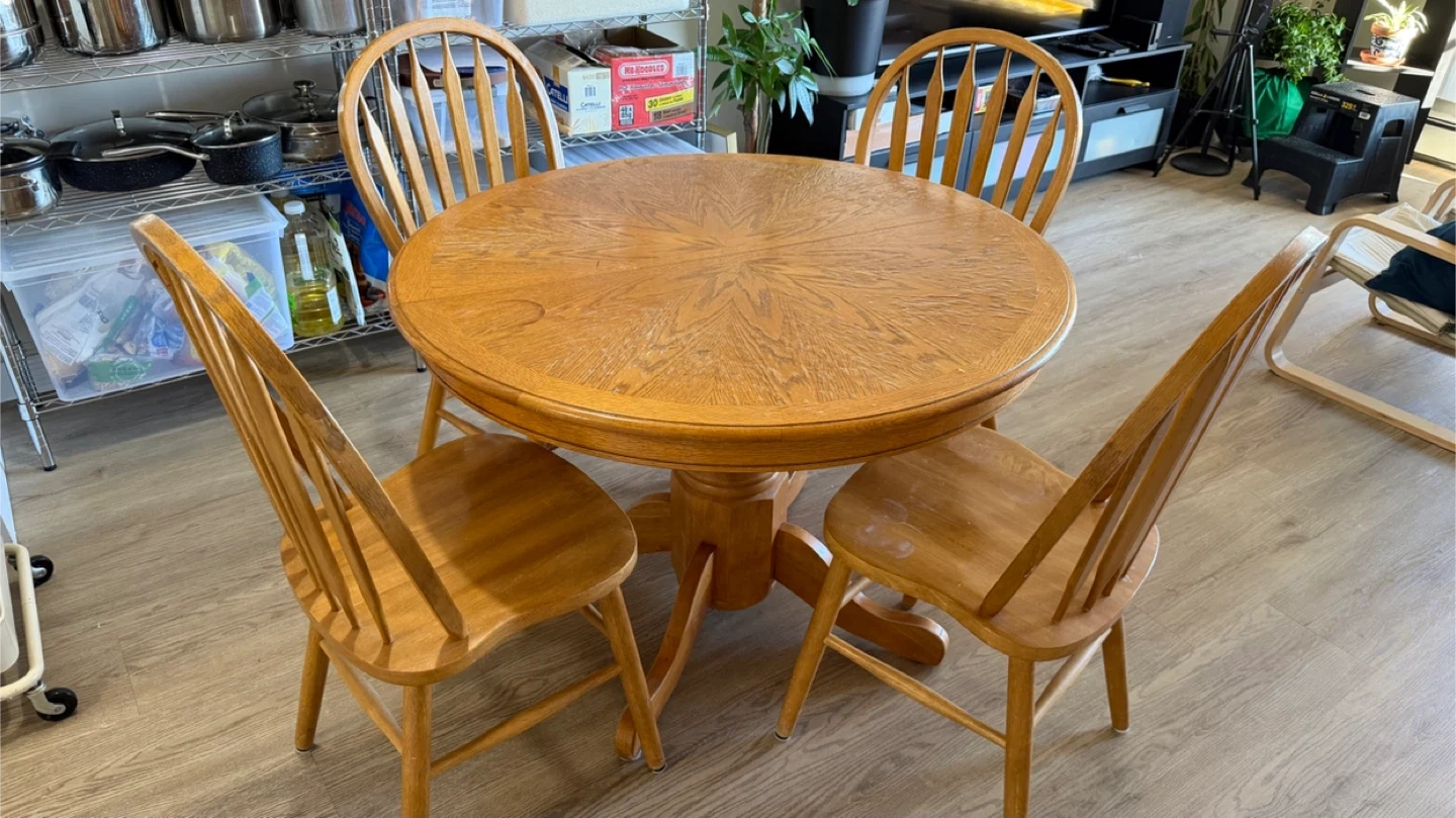 Selling a round wooden dining table that comes with four matching chairs. The table features a lovely patterned top and a sturdy pedestal base. The chairs have a classic spindle back design. It's a great set for a smaller dining area!