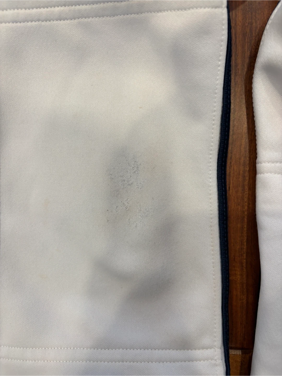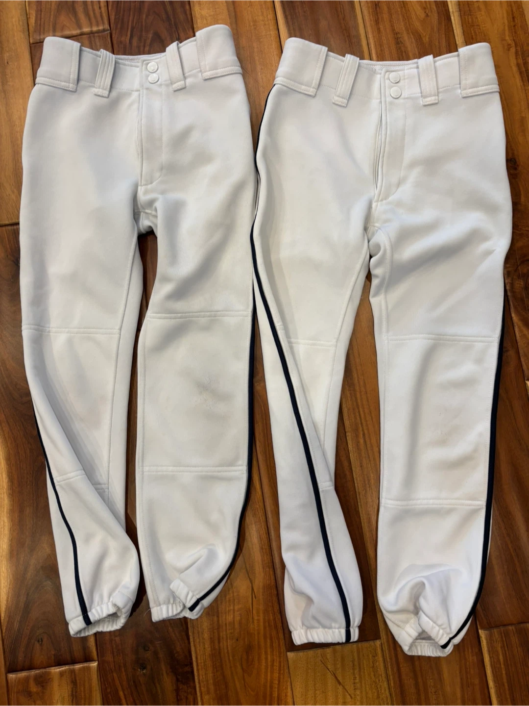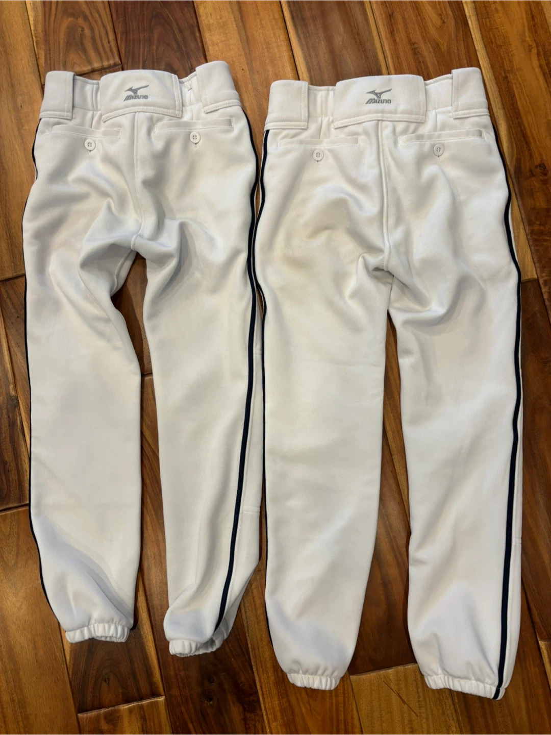 Selling a two pairs of Mizuno baseball pants in white with navy blue stripe. They have some signs of use, as pictured. Only used for 1 year of select baseball.