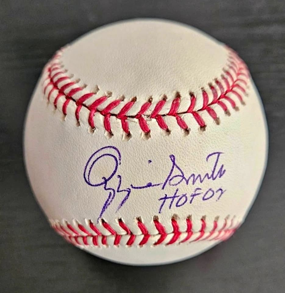 This baseball is an original signed MLB baseball by Ozzie Smith, a Hall of Famer who played for the St. Louis Cardinals. The baseball is inscribed with "HOF02" and is a valuable collectible for fans of the team or the player.