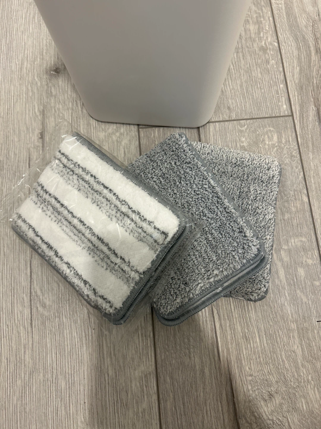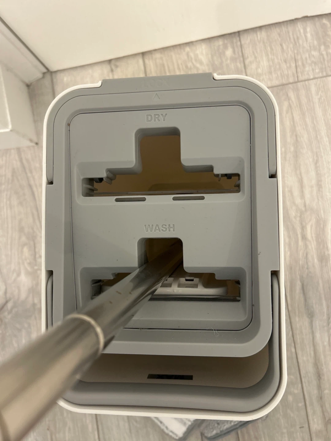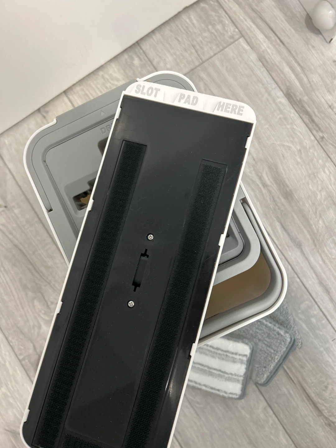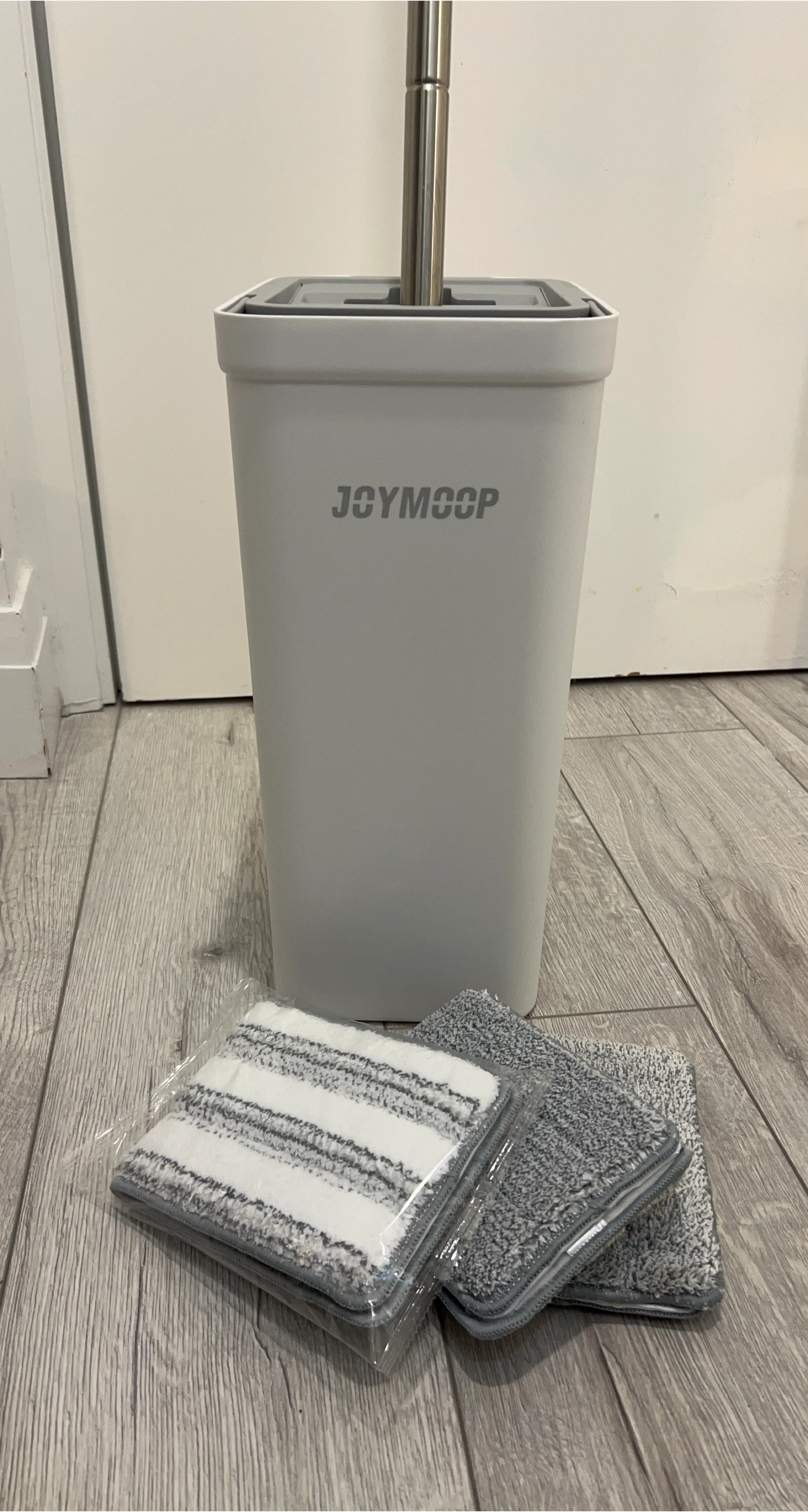 I'm selling a Joymoop mop and bucket set! It's in great condition and ready to help keep your floors sparkling clean. The set includes the bucket with separate wash and dry compartments, the mop handle, the mop head, and several mop pads.