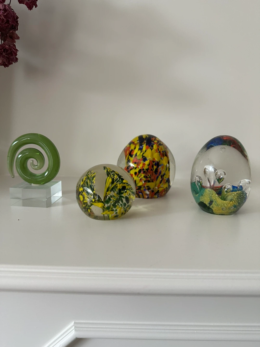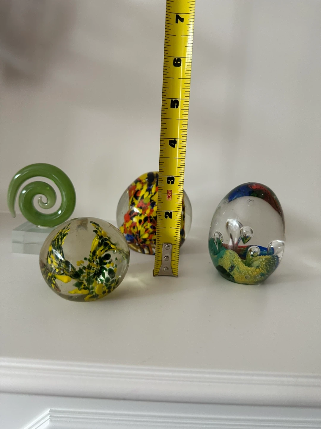 Here's a set of four unique art glass paperweights to add a touch of charm to your space! The set includes a green swirl design, and three spherical paperweights with colourful internal designs. One image shows the paperweights are approximately 3 inches tall. They're in great condition and ready to brighten up your desk or shelf!