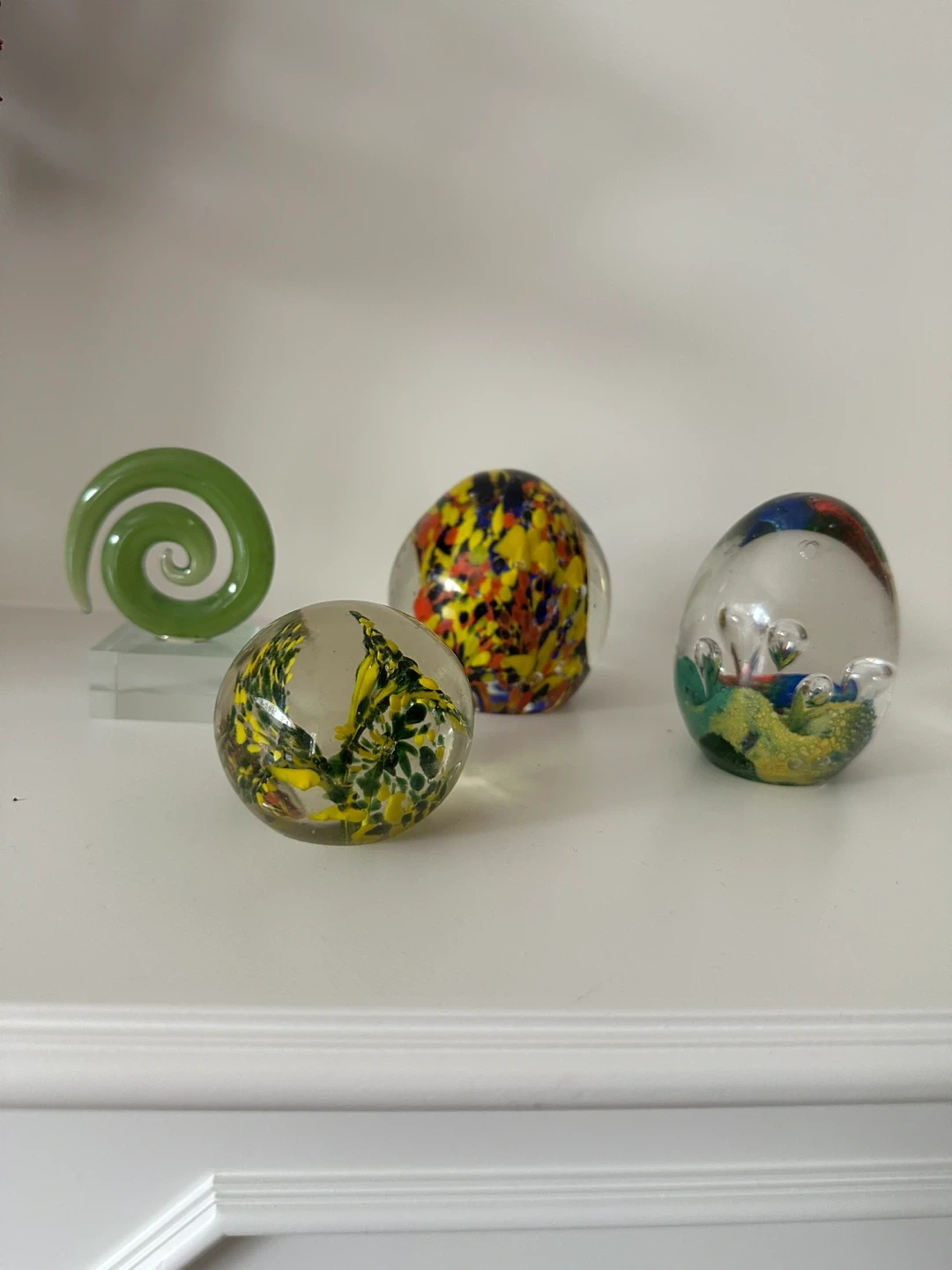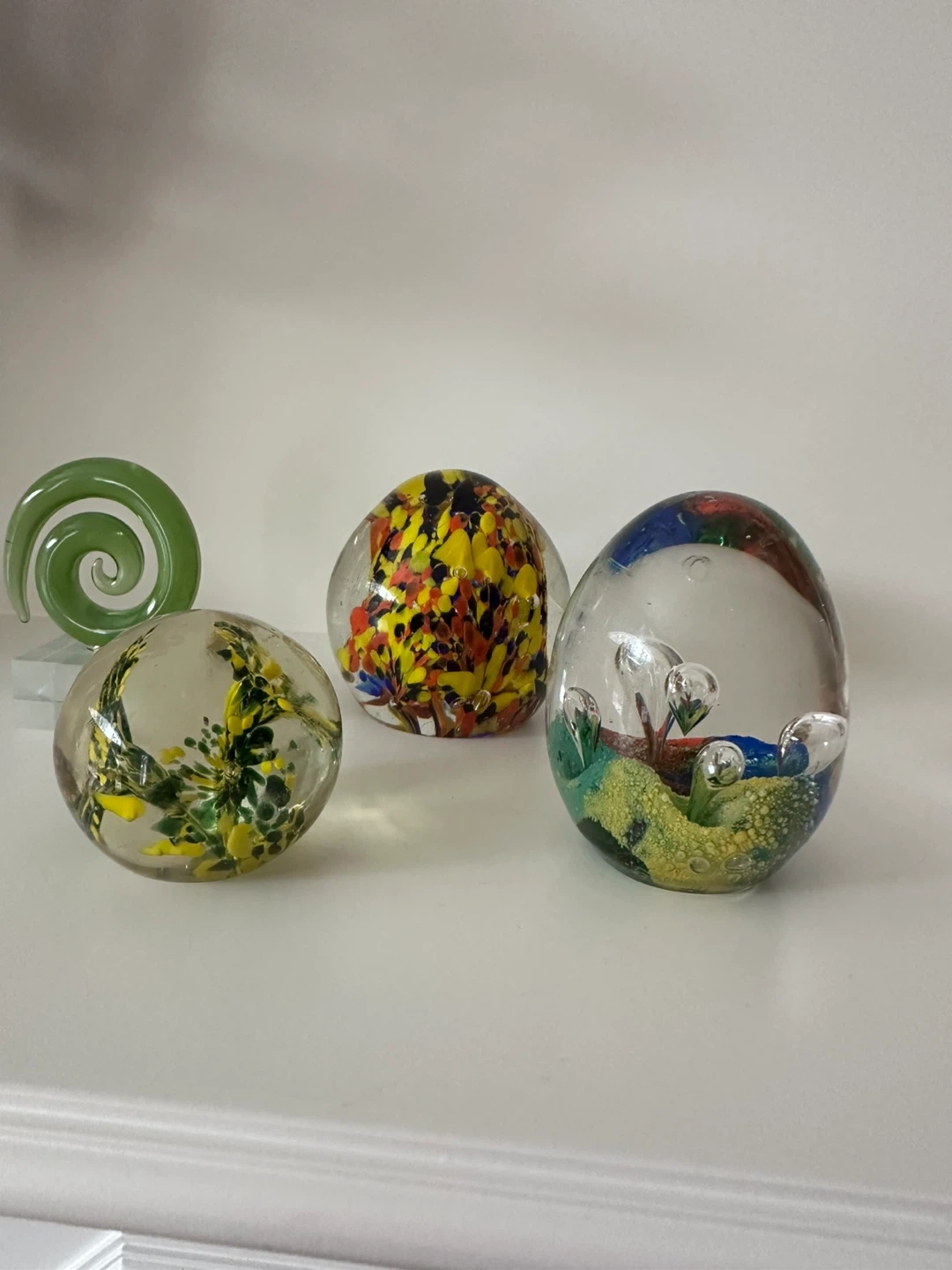 Here's a set of four unique art glass paperweights to add a touch of charm to your space! The set includes a green swirl design, and three spherical paperweights with colourful internal designs. One image shows the paperweights are approximately 3 inches tall. They're in great condition and ready to brighten up your desk or shelf!