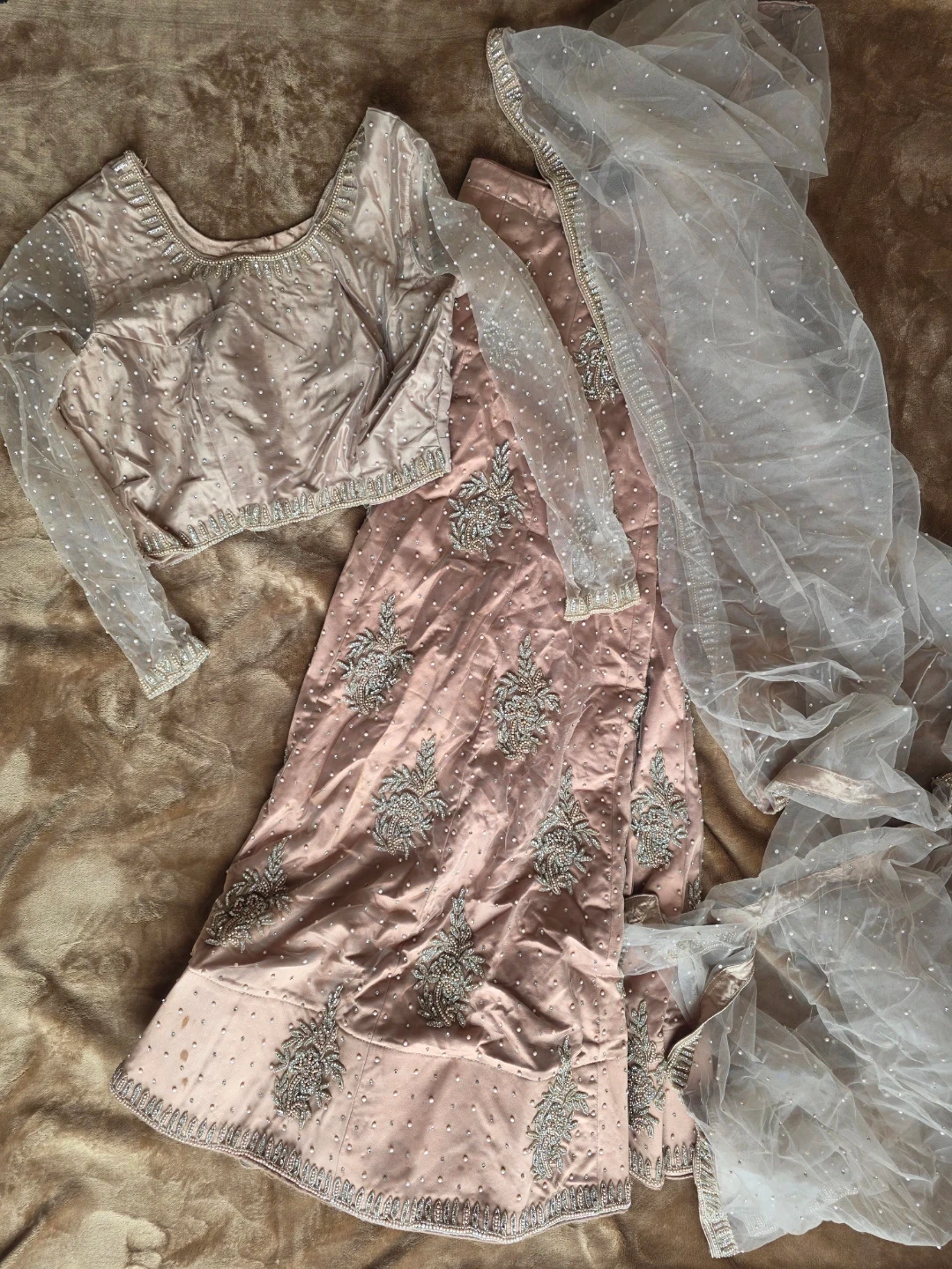 Selling a beautiful lehenga choli set with intricate embroidery and beadwork. The set includes a skirt (lehenga), a blouse (choli), and a dupatta (scarf). It's in great condition and perfect for a special occasion! Heavy stone work.