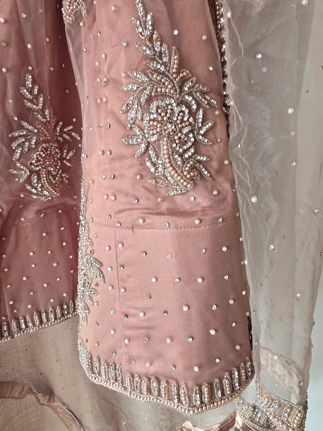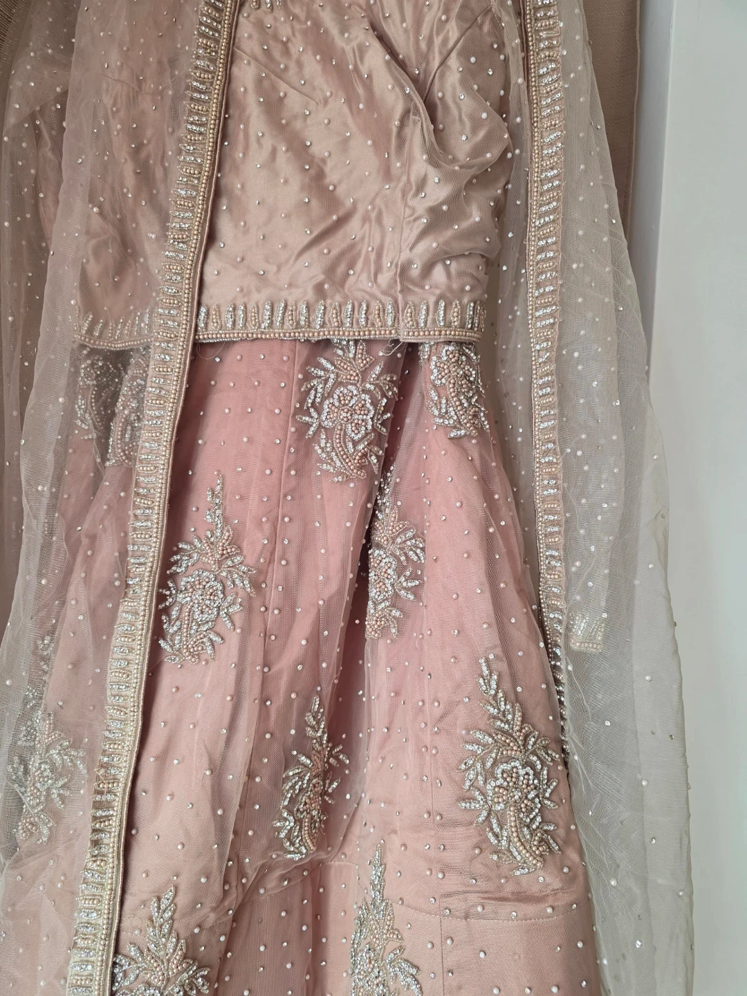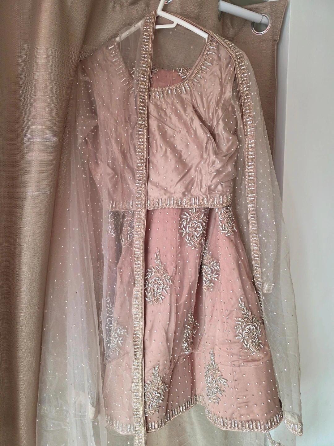Selling a beautiful lehenga choli set with intricate embroidery and beadwork. The set includes a skirt (lehenga), a blouse (choli), and a dupatta (scarf). It's in great condition and perfect for a special occasion! Heavy stone work.