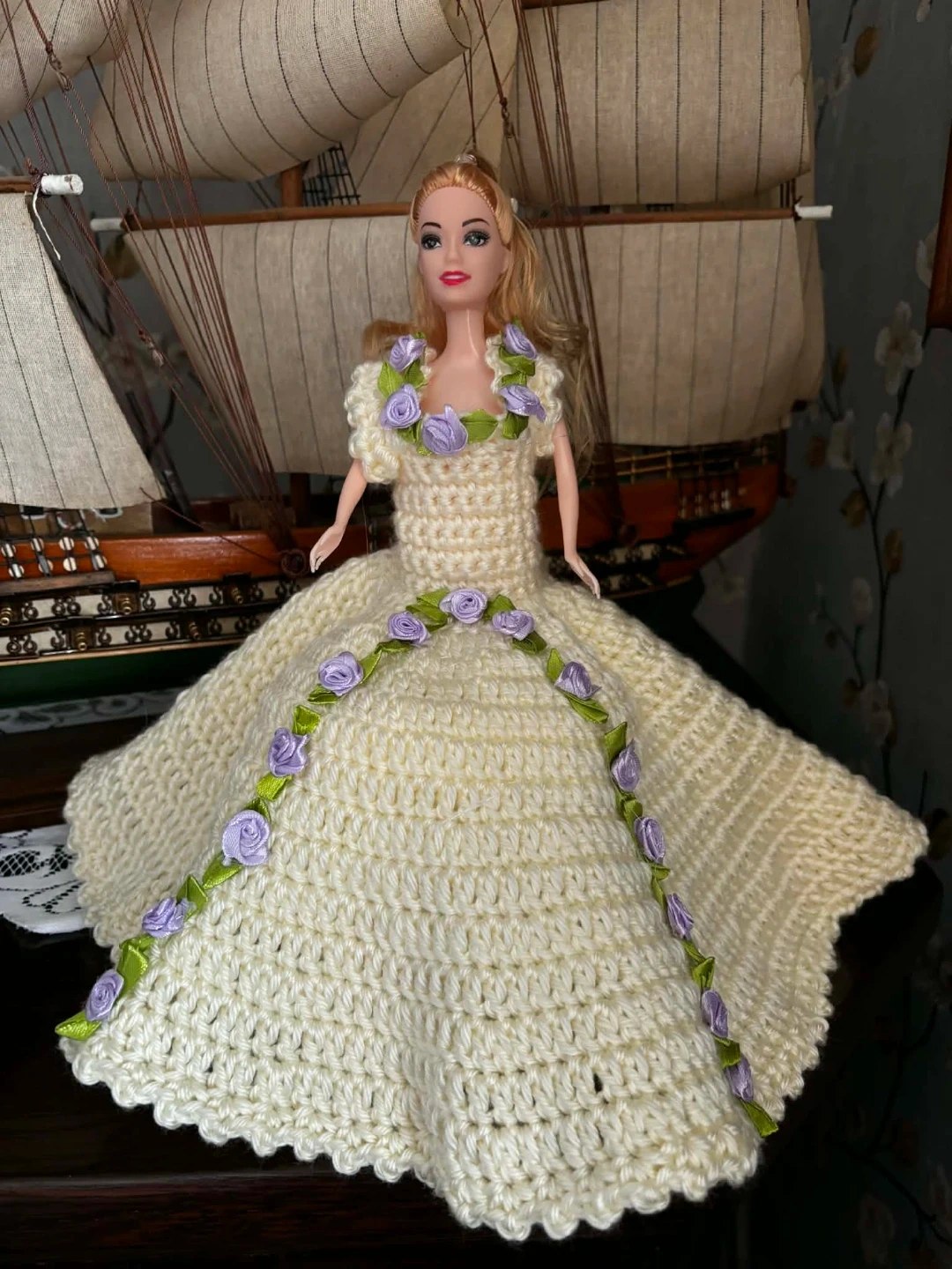 Selling a charming, handmade crocheted dress for a Barbie doll! It's a lovely cream colour with delicate purple rose accents. Perfect for adding a unique touch to any Barbie collection
