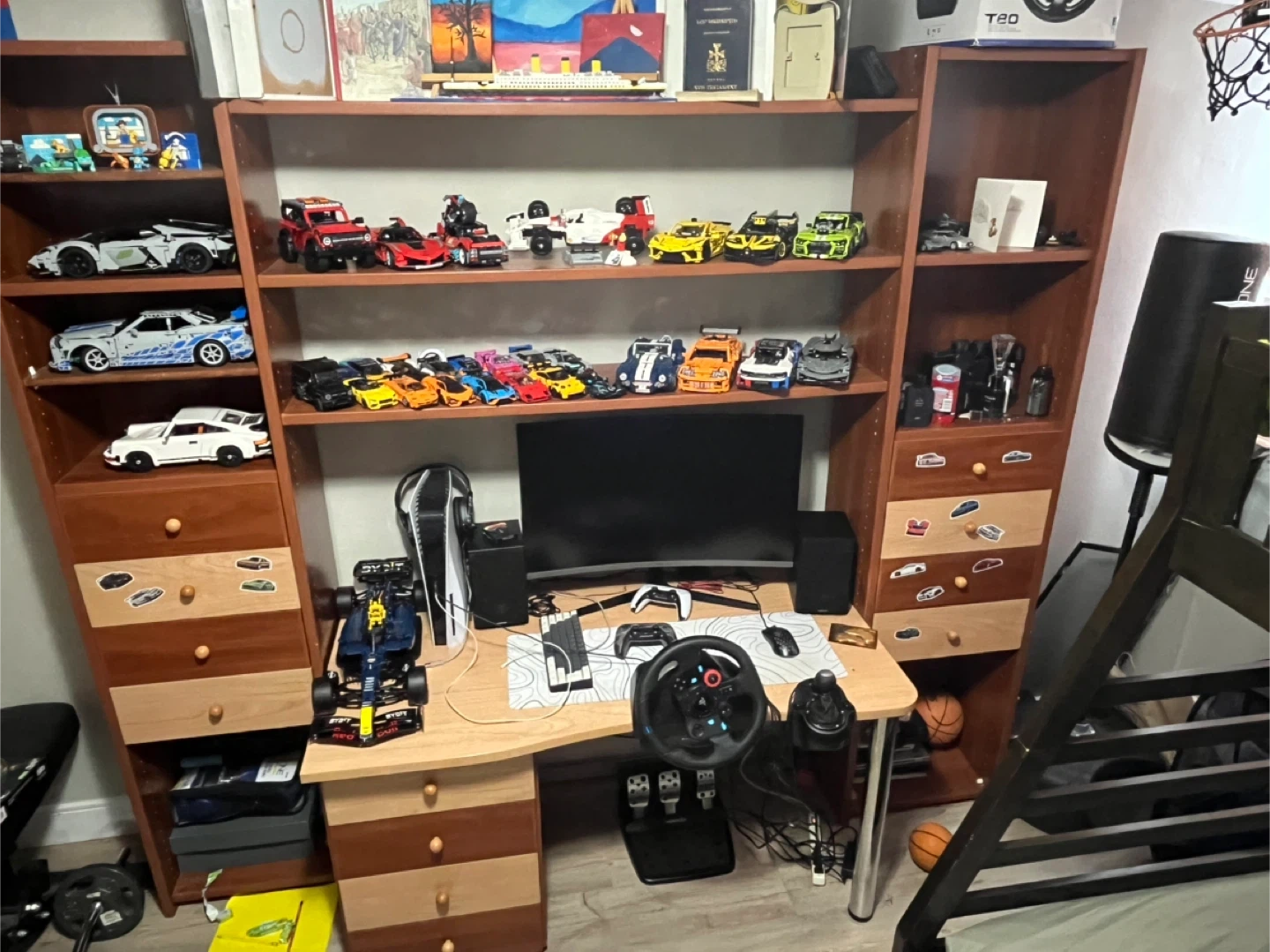Storage shelves, 12 drawers and a desk
