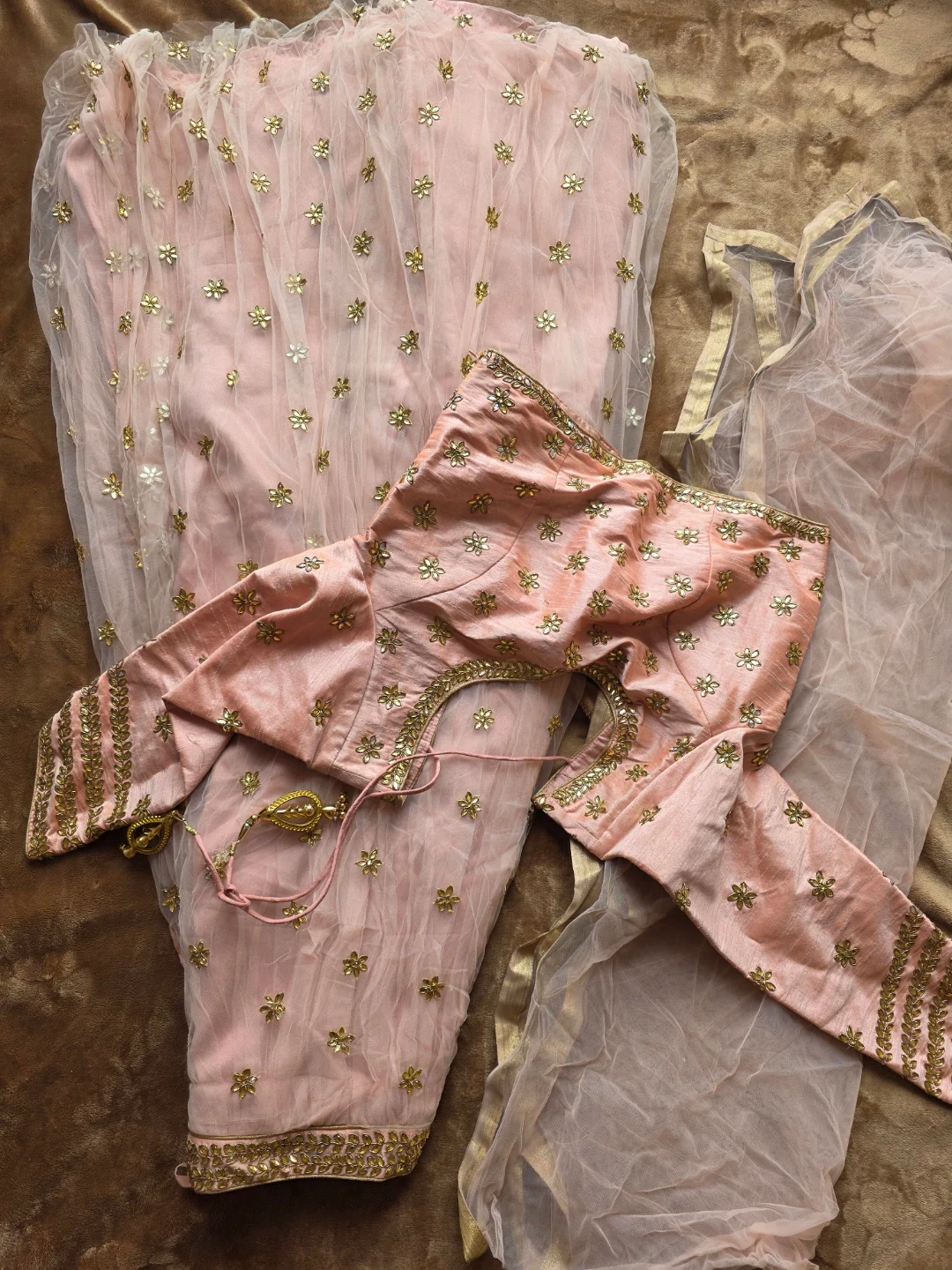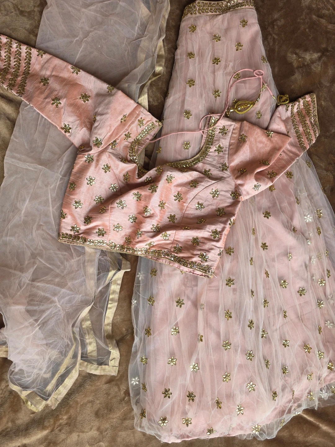 Beautiful pink lehenga choli set with gold floral embroidery. This set is perfect for weddings or special occasions. The fabric is lightweight and comfortable, making it easy to wear for long periods of time. The intricate detailing adds a touch of elegance and sophistication to the overall look