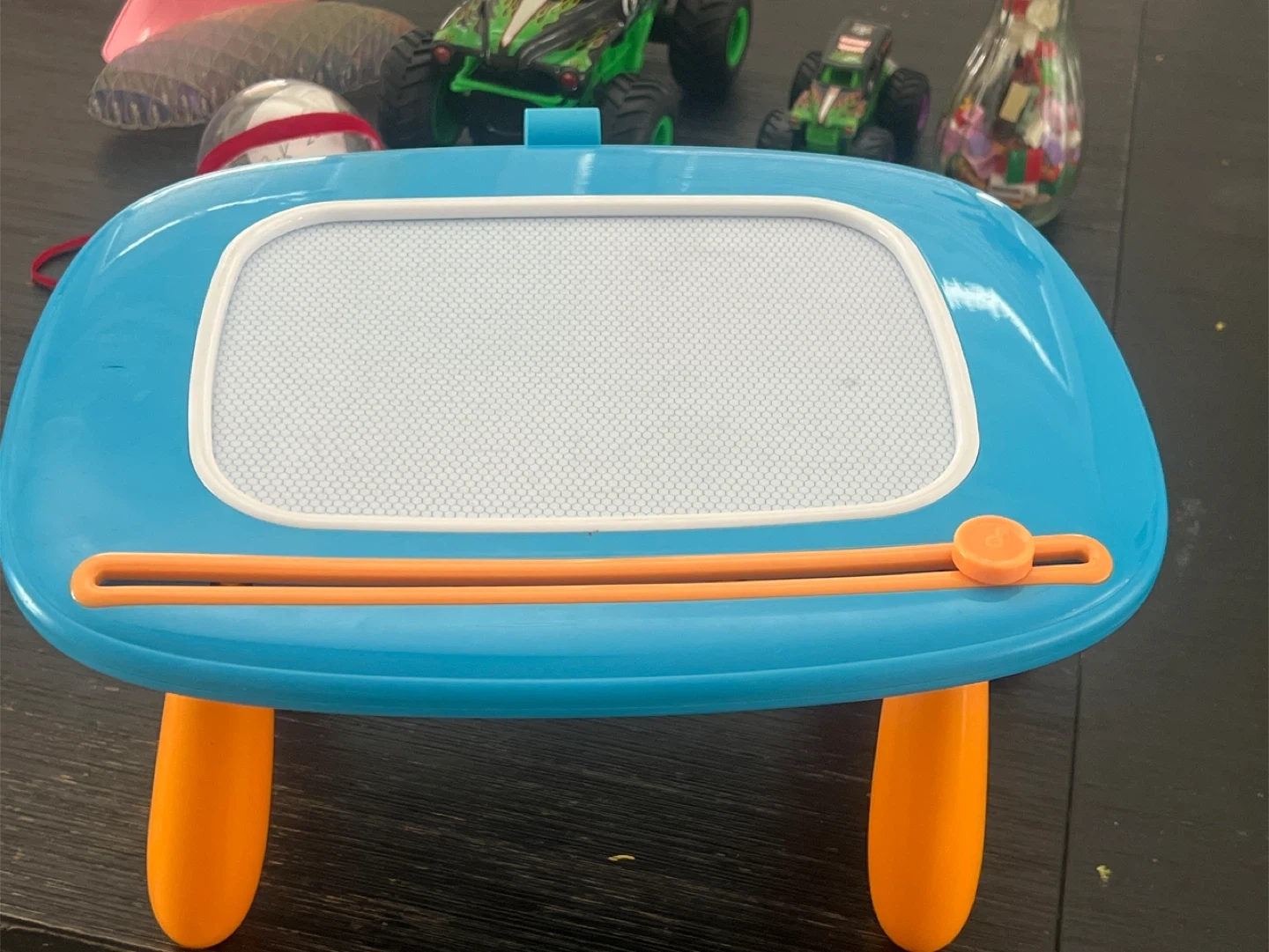 I'm selling a kids drawing board! It's in good condition and ready for a new artist. It's blue and orange with a white drawing surface. Perfect for creative fun!