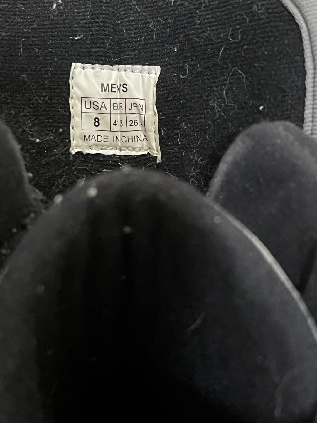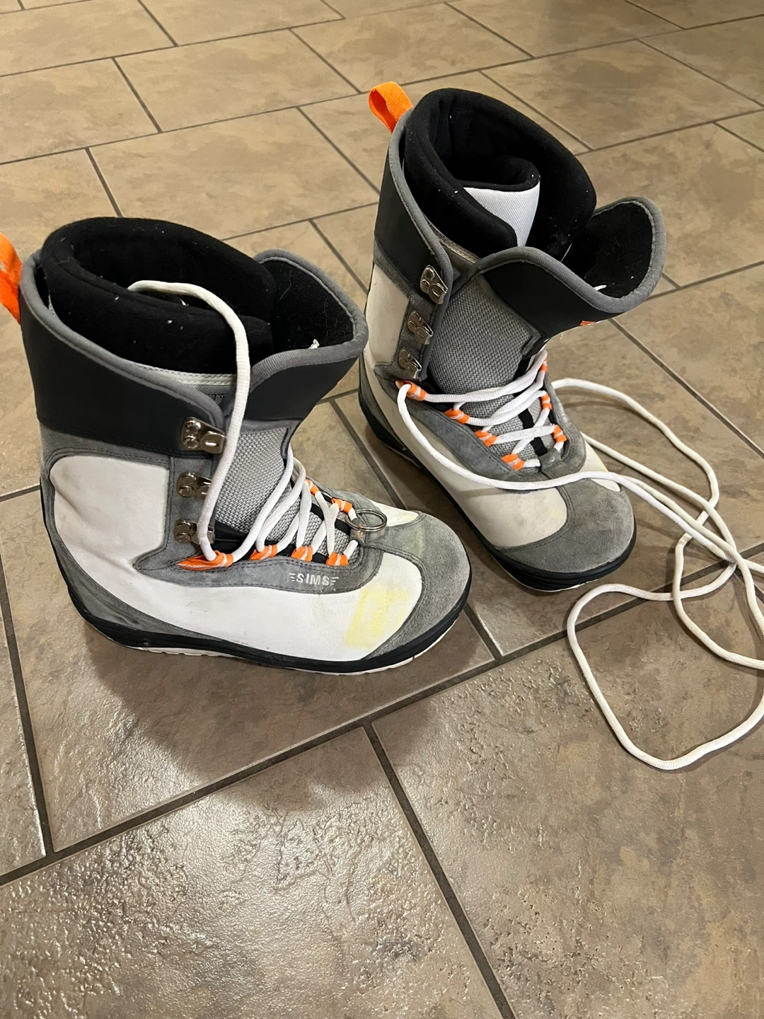 Selling a pair of Sims men's snowboard boots in size 8. They're in good condition and ready for the slopes! The boots feature a grey and white design with orange accents. Perfect for a comfortable and secure fit while snowboarding.