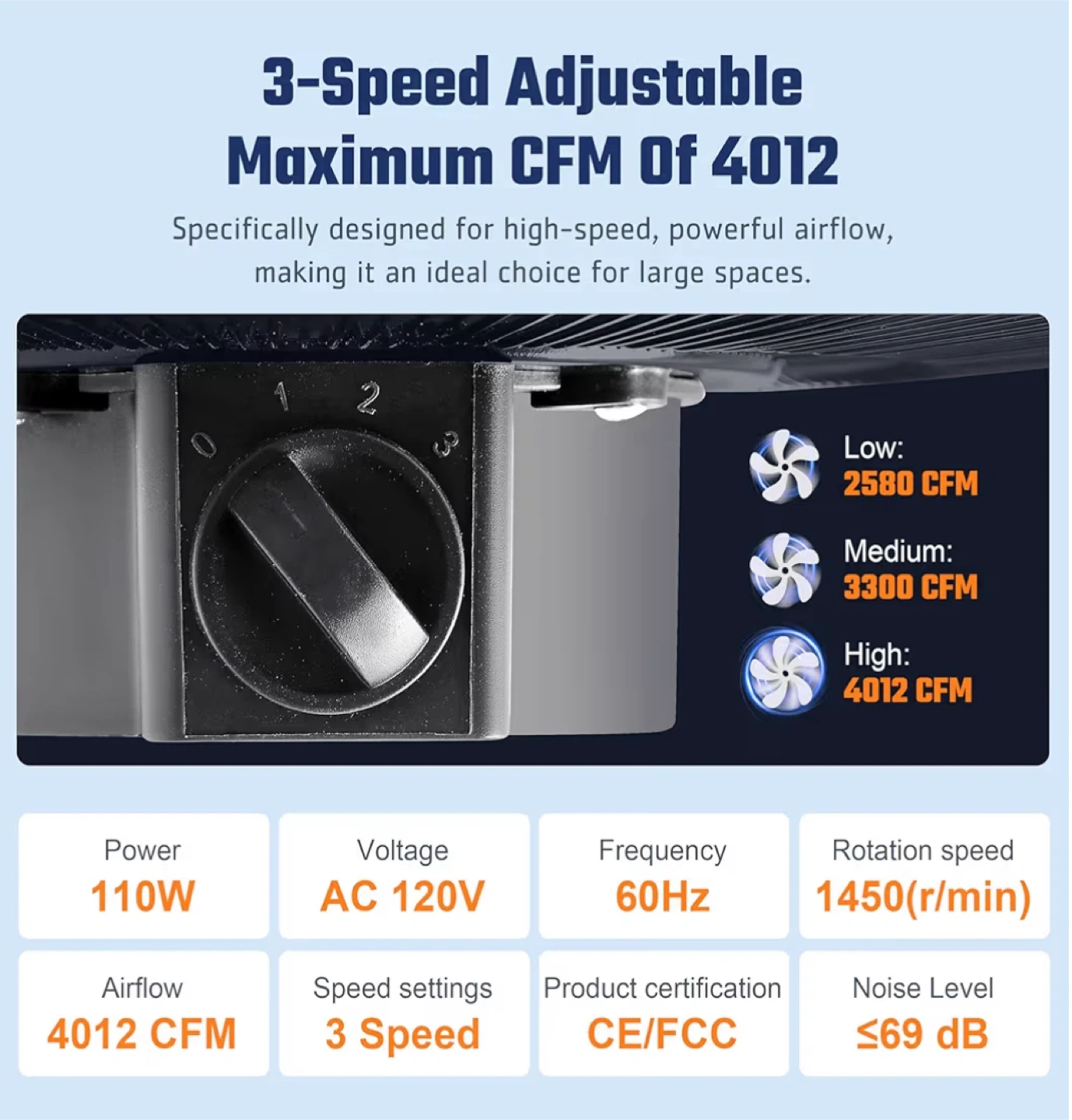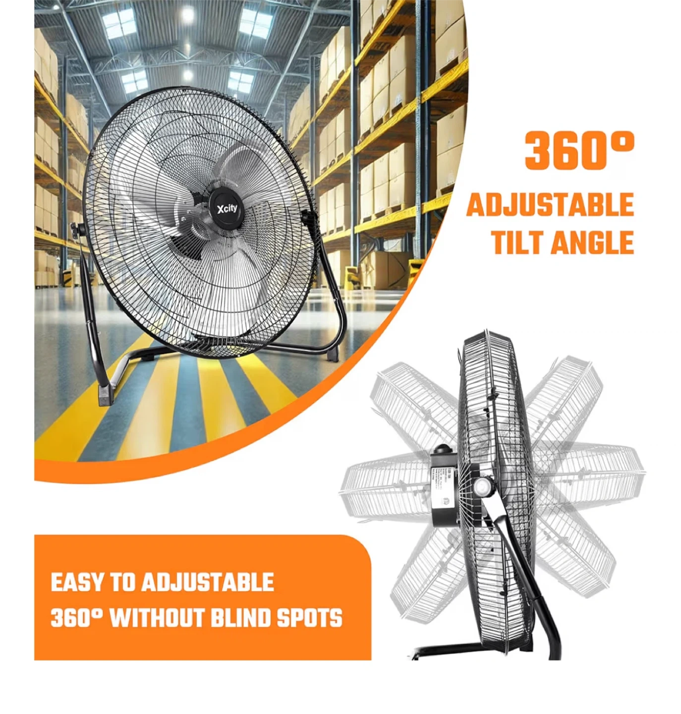 This is an Xcity 18-inch high-velocity, heavy-duty metal industrial floor fan. It's easy to adjust to a 360° tilt angle, ensuring no blind spots. The fan has a 20-inch (51cm) diameter and stands 6.2 inches (15.8cm) tall, with a base of 21.5 inches (54.5cm). It's in great condition and comes with its original box