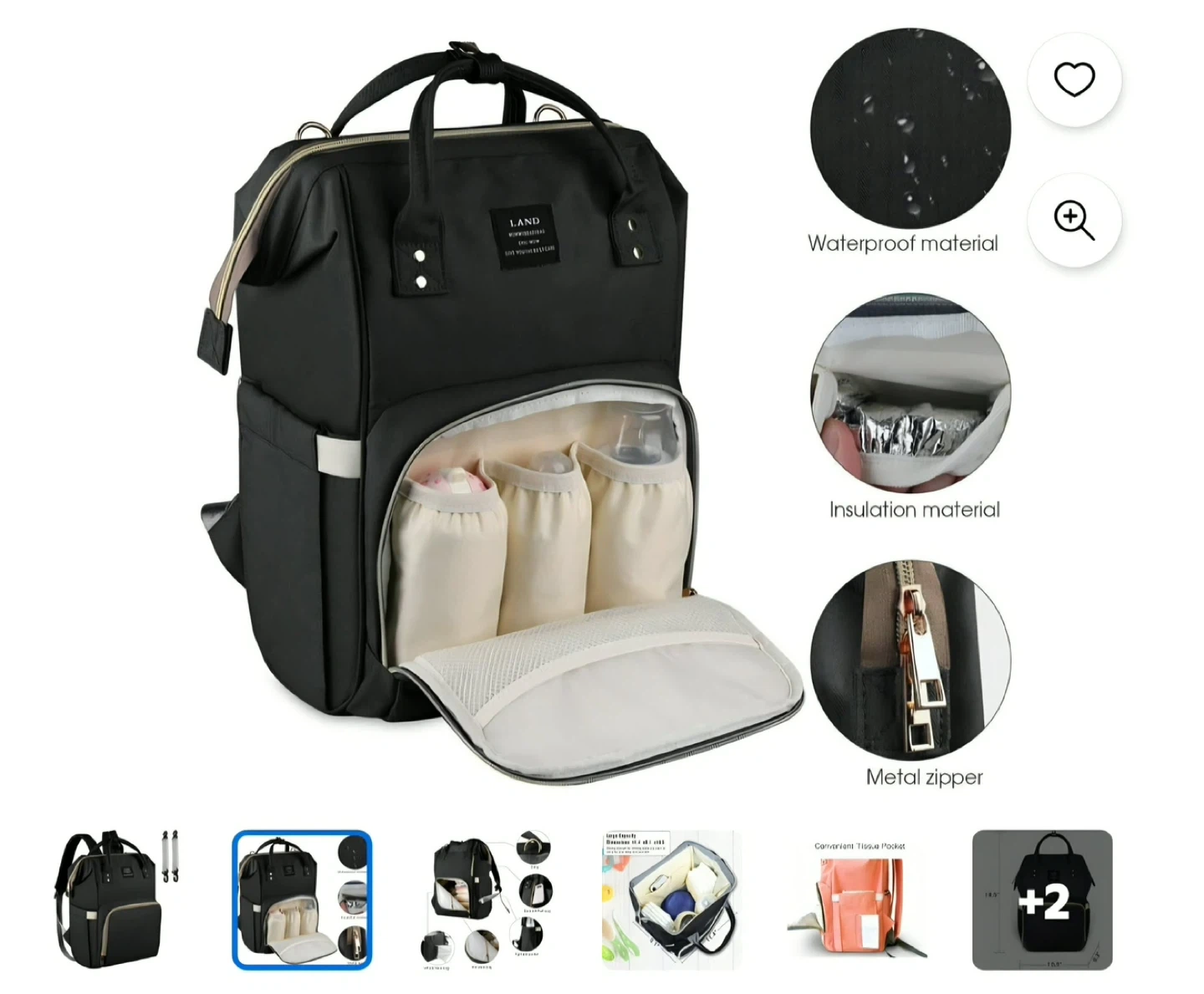 This LAND diaper bag backpack is perfect for parents on the go! It features a large capacity with dimensions of 11.4 x 9.1 x 16.5 inches, providing plenty of room for all your baby essentials. The bag is made of waterproof material and has a metal zipper for durability. It also includes insulation pockets to keep bottles warm or cool. It's in brandnew condition and ready to help you stay organized!