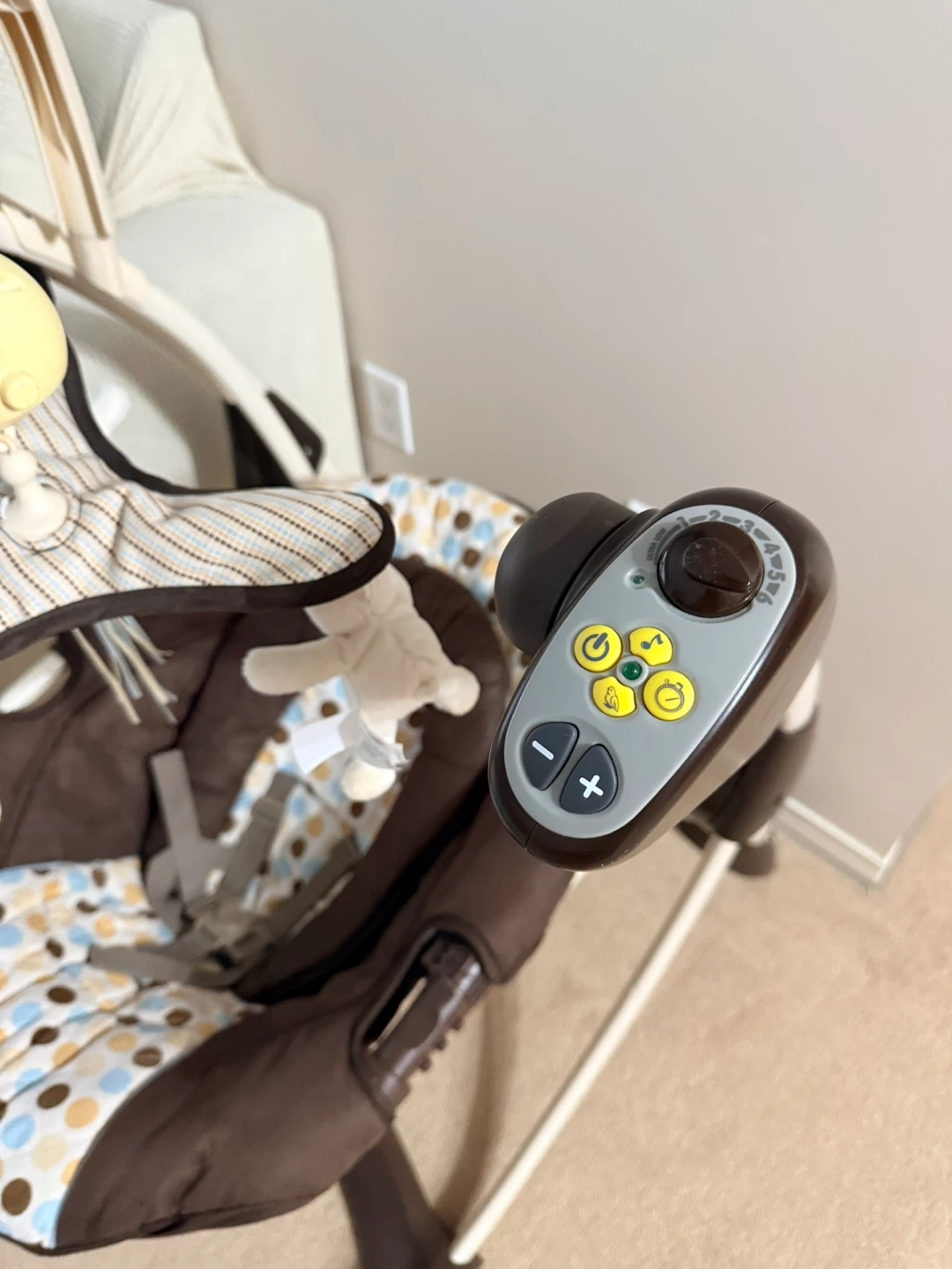 Selling a gently used baby swing! It features a soothing vibration function to help calm your little one. The swing is brown with a colourful polka dot pattern on the seat. It also comes with hanging toys to keep baby entertained