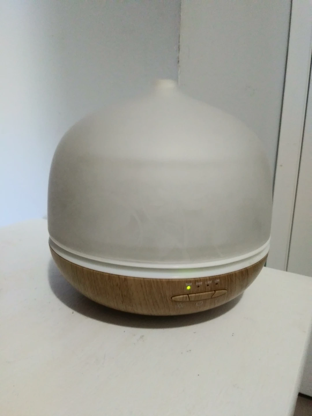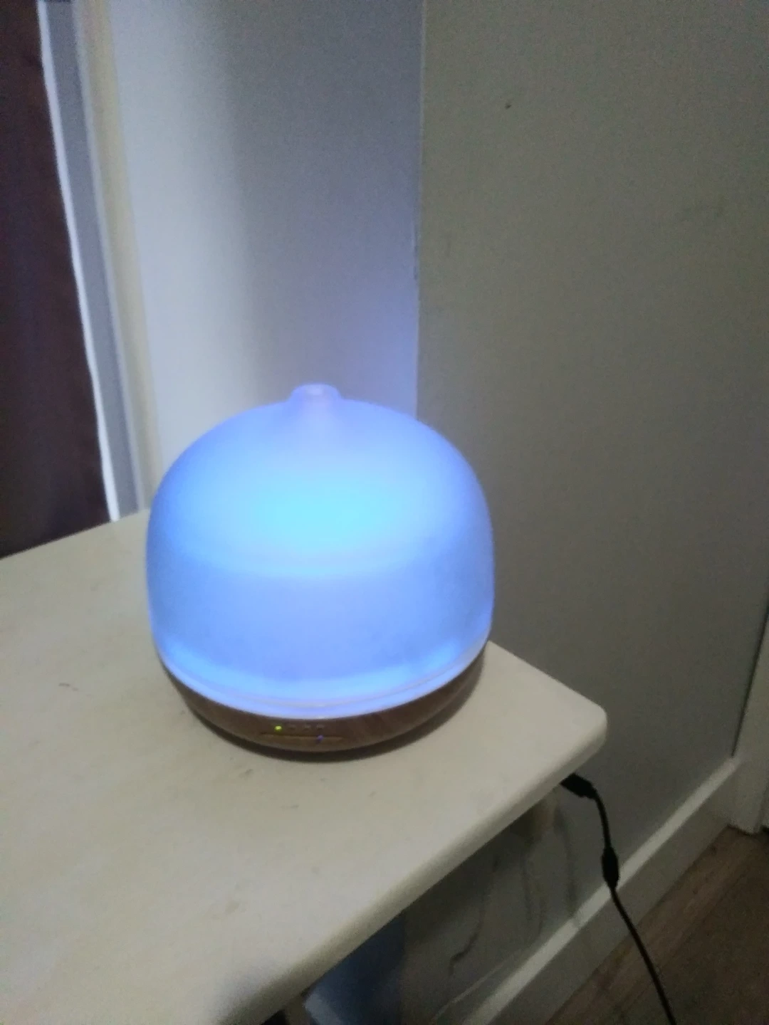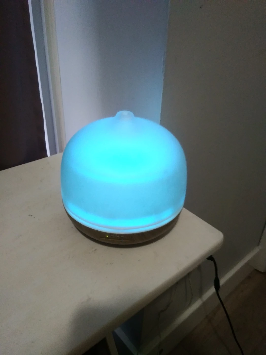 I'm selling an aroma diffuser! It's in great condition and ready to use. It has a wood-look base and a translucent top that lights up with different colours. Perfect for adding a relaxing scent to any room