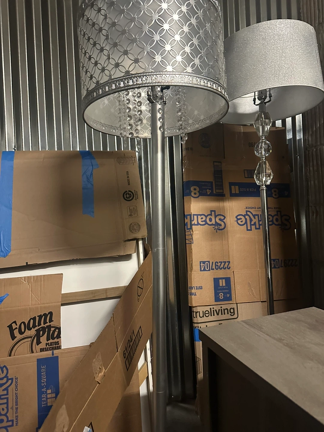 Selling a silver floor lamp from True Living! It's in great condition and would look great in any room. The lamp features a decorative shade and a sleek silver finish with hanging crystals must be picked up asap heavy base