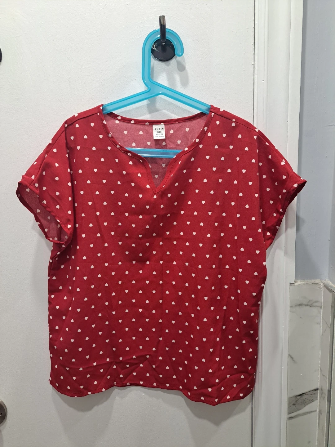 Selling a cute Shein blouse with a red background and white heart pattern! The size is 11-12Y.