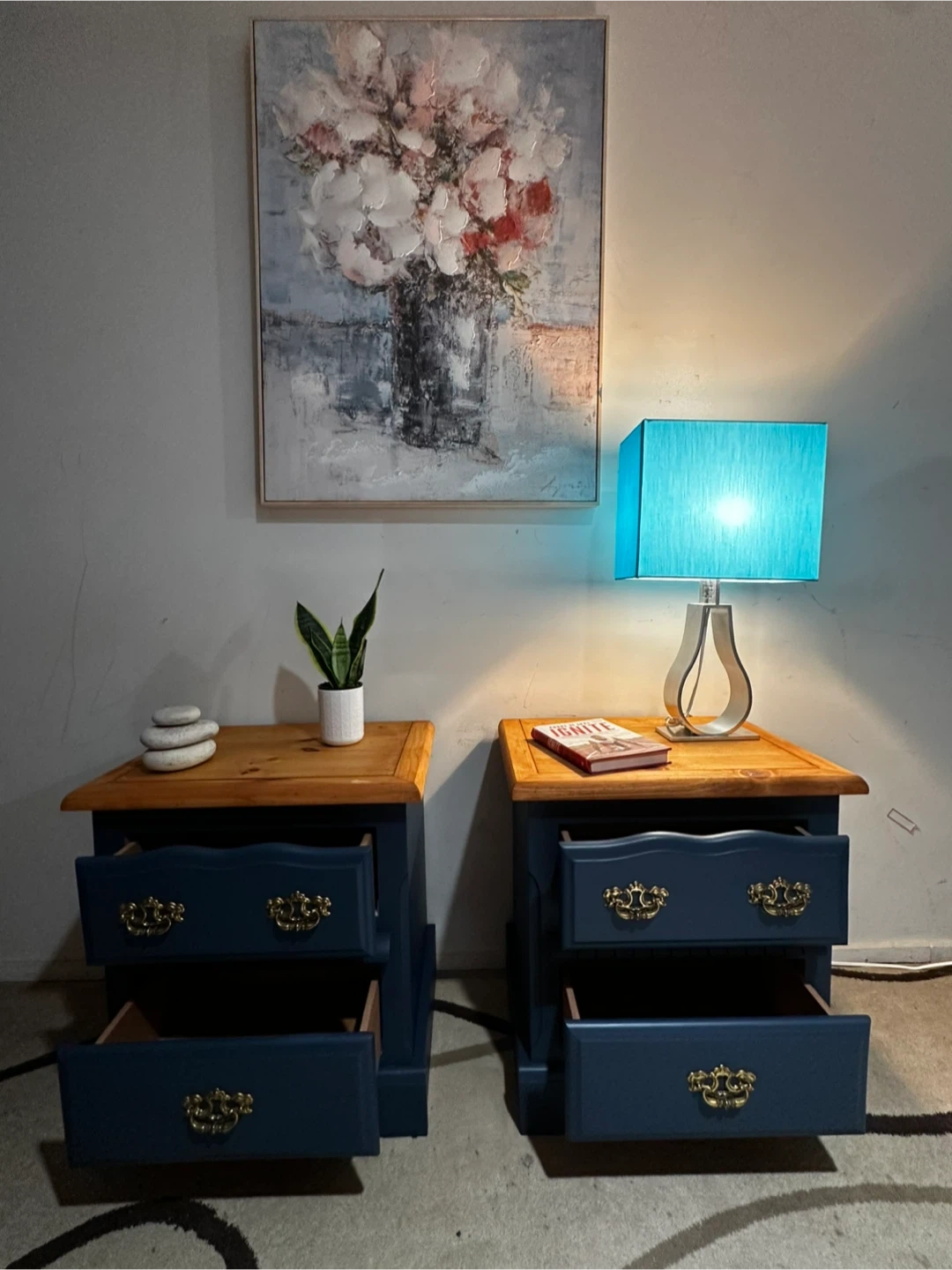 Beautiful pair of matching nightstands freshly refinished in blue with warm solid wood tops. Classic brass hardware adds a timeless touch.