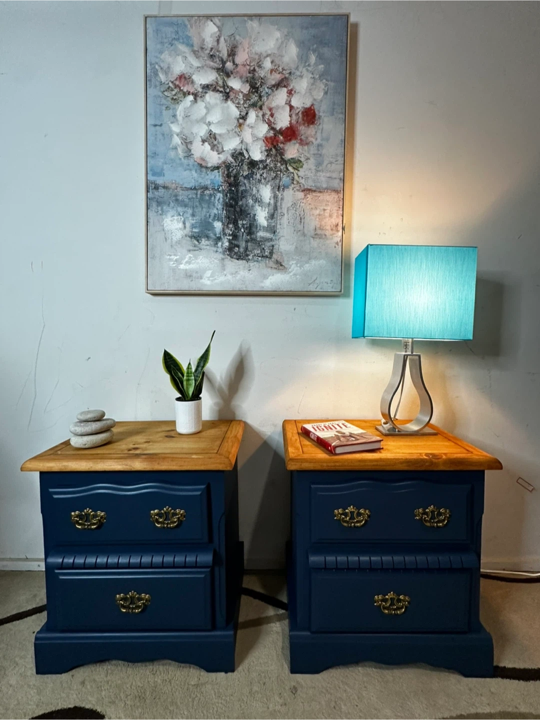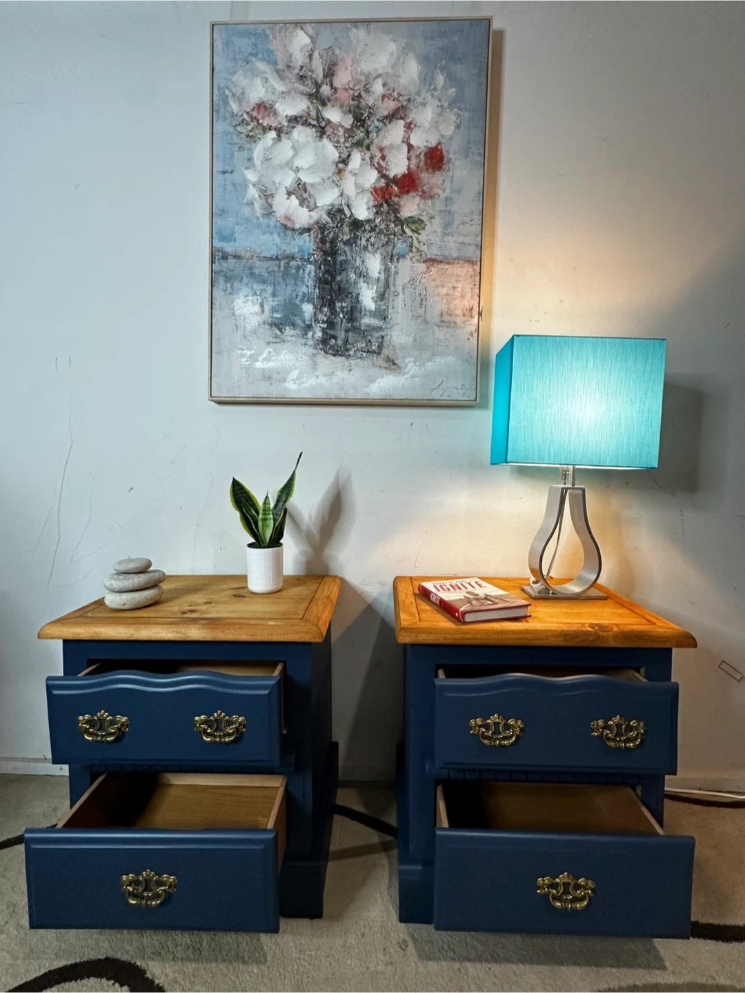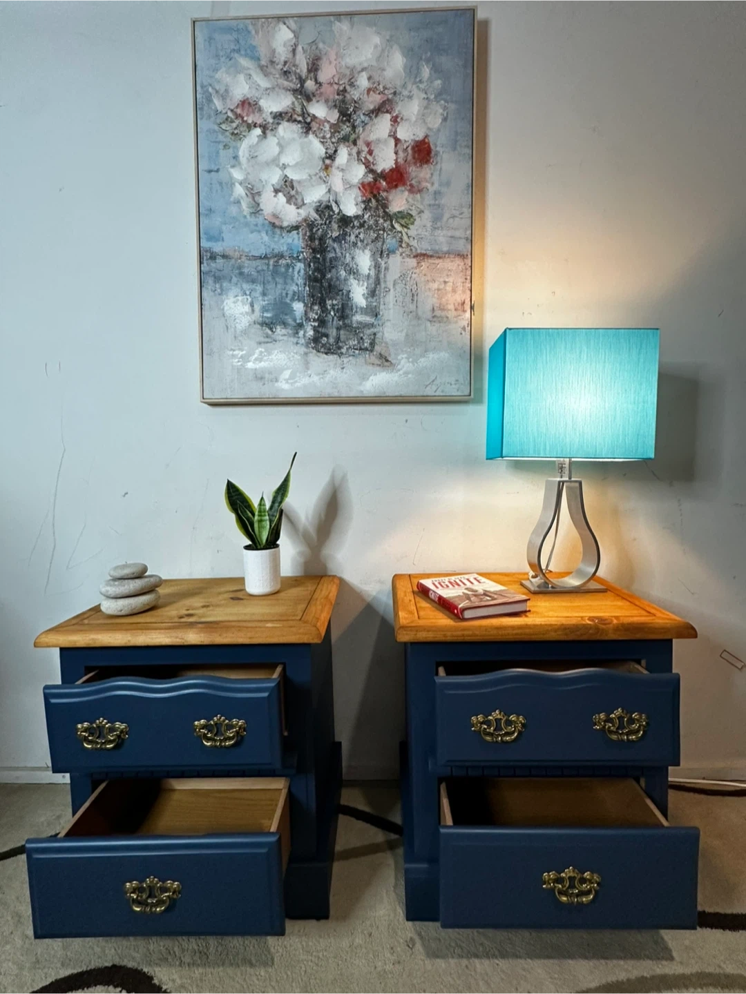 Beautiful pair of matching nightstands freshly refinished in blue with warm solid wood tops. Classic brass hardware adds a timeless touch.