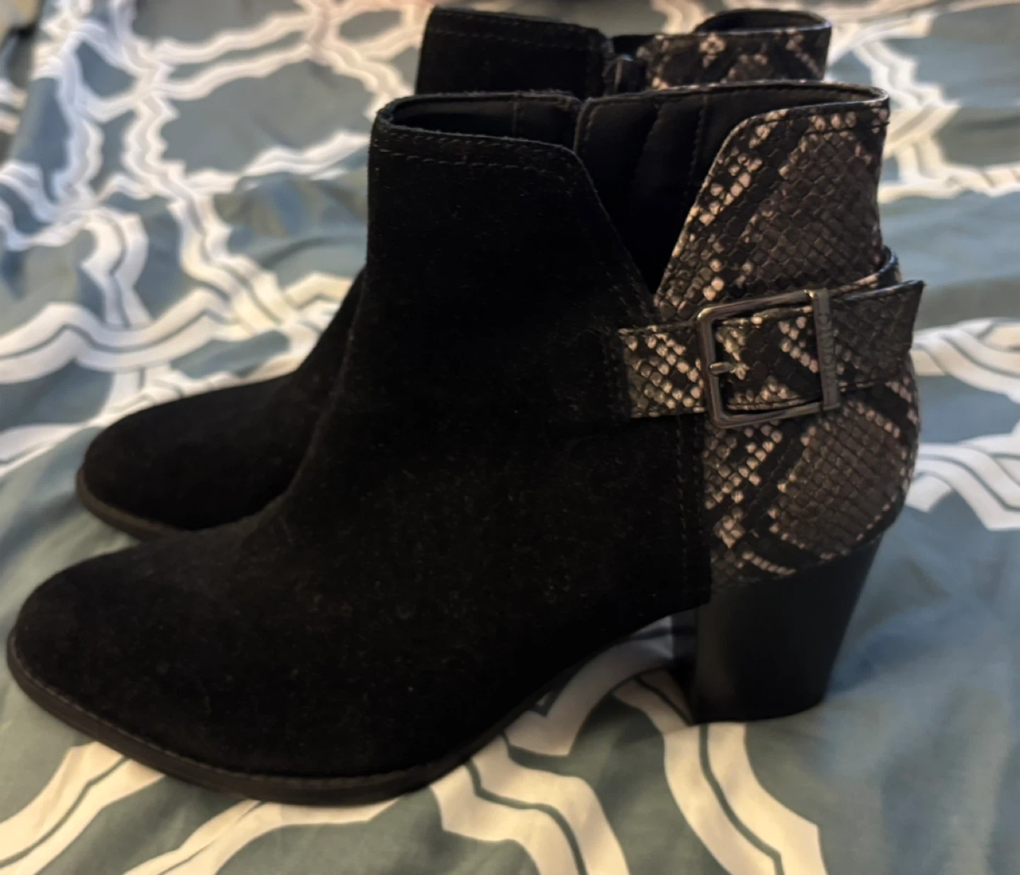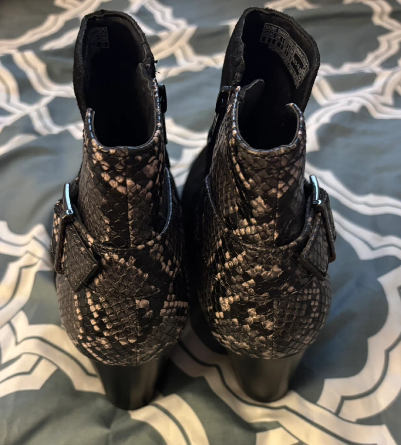 Selling a pair of Vionic ankle boots in black! They are a size 8. The boots feature a stylish snakeskin print on the side and a comfortable heel height. Perfect for adding a touch of chic to any outfit