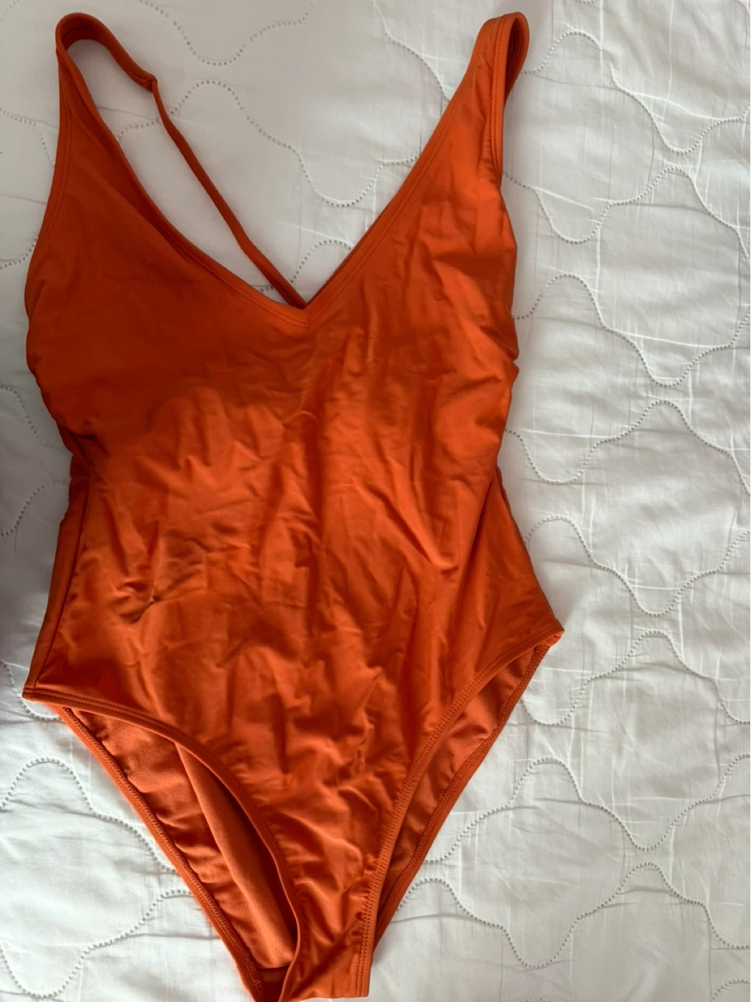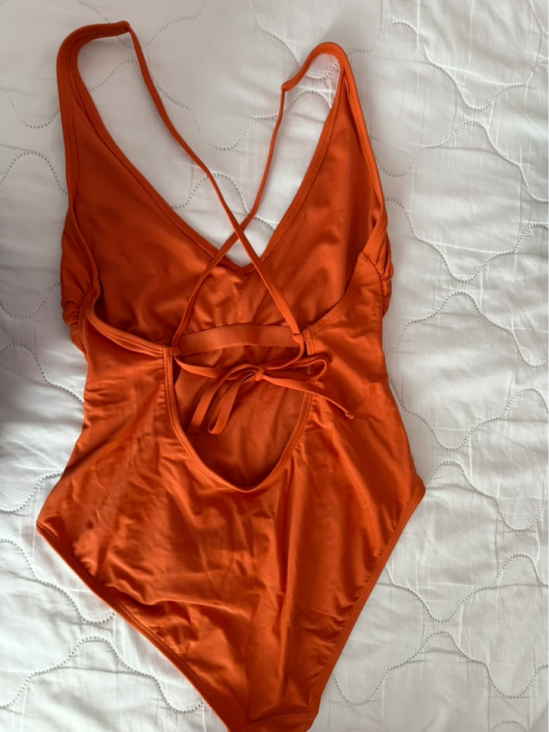 Here's a vibrant orange one-piece swimsuit! It features a V-neck and a stylish criss-cross back. Perfect for swimming or lounging by the pool