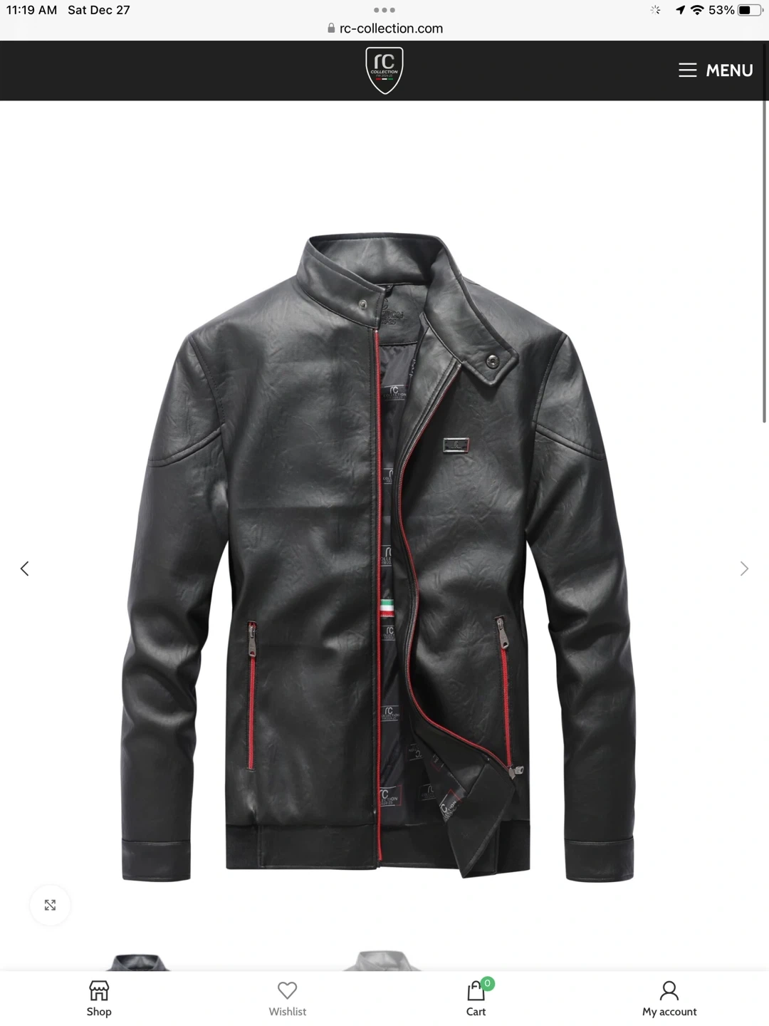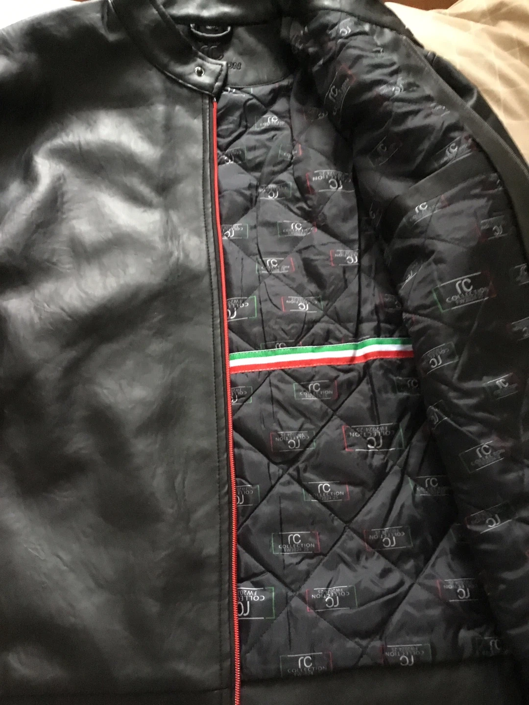 Selling a stylish black leather jacket from RC Collection! It features a sleek design with red zipper accents and a unique patterned lining. Perfect for adding a touch of sophistication to your wardrobe