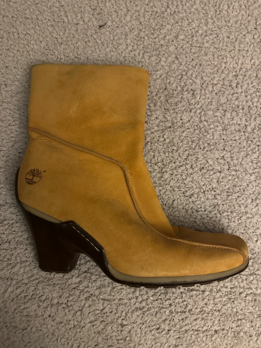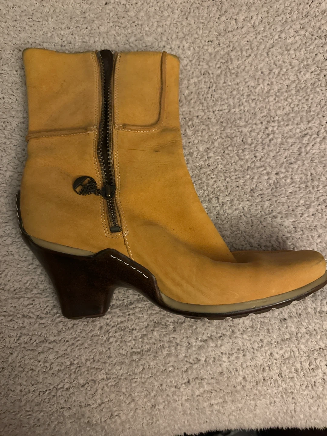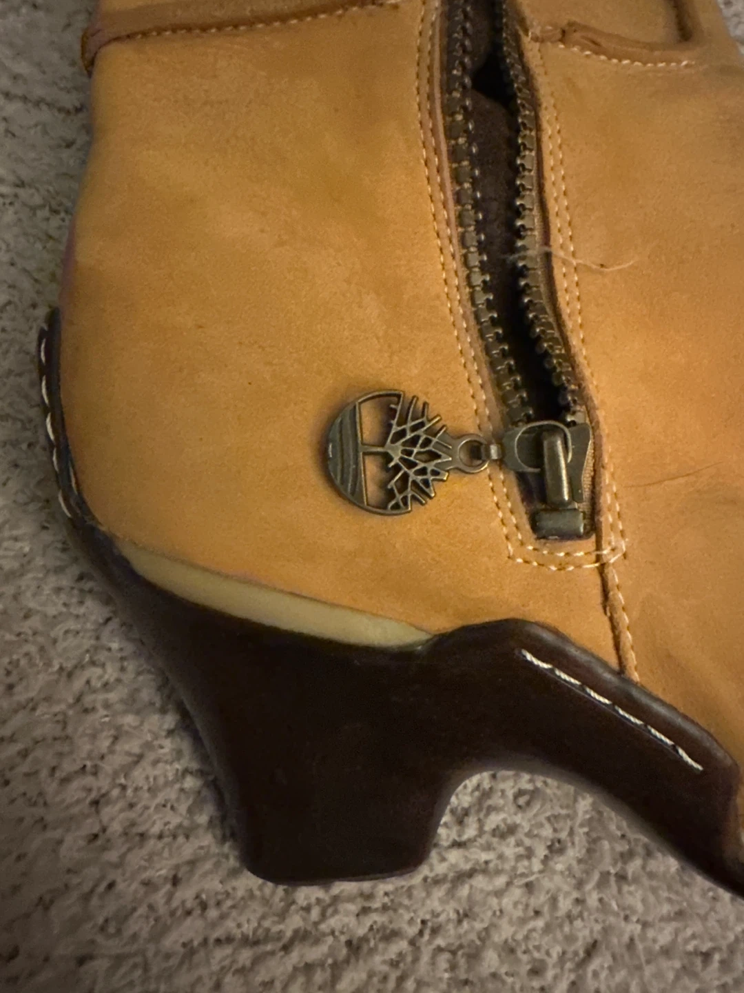 These Timberland ankle boots have a stylish heel and a convenient side zipper. They're perfect for adding a touch of flair to your outfit! Women’s size 9.5