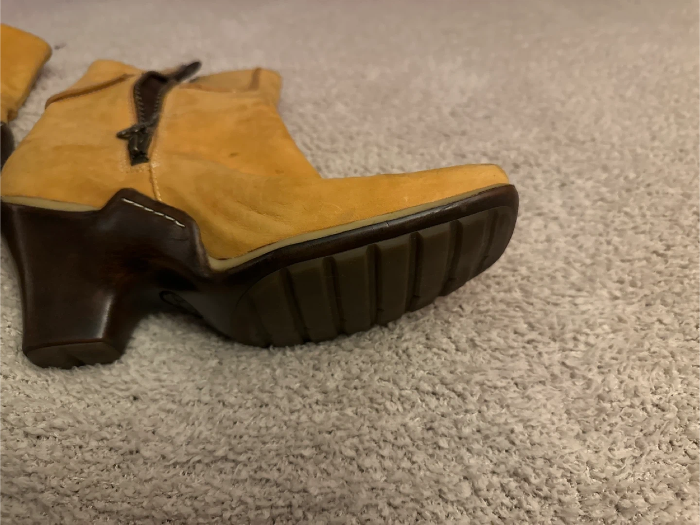 These Timberland ankle boots have a stylish heel and a convenient side zipper. They're perfect for adding a touch of flair to your outfit! Women’s size 9.5