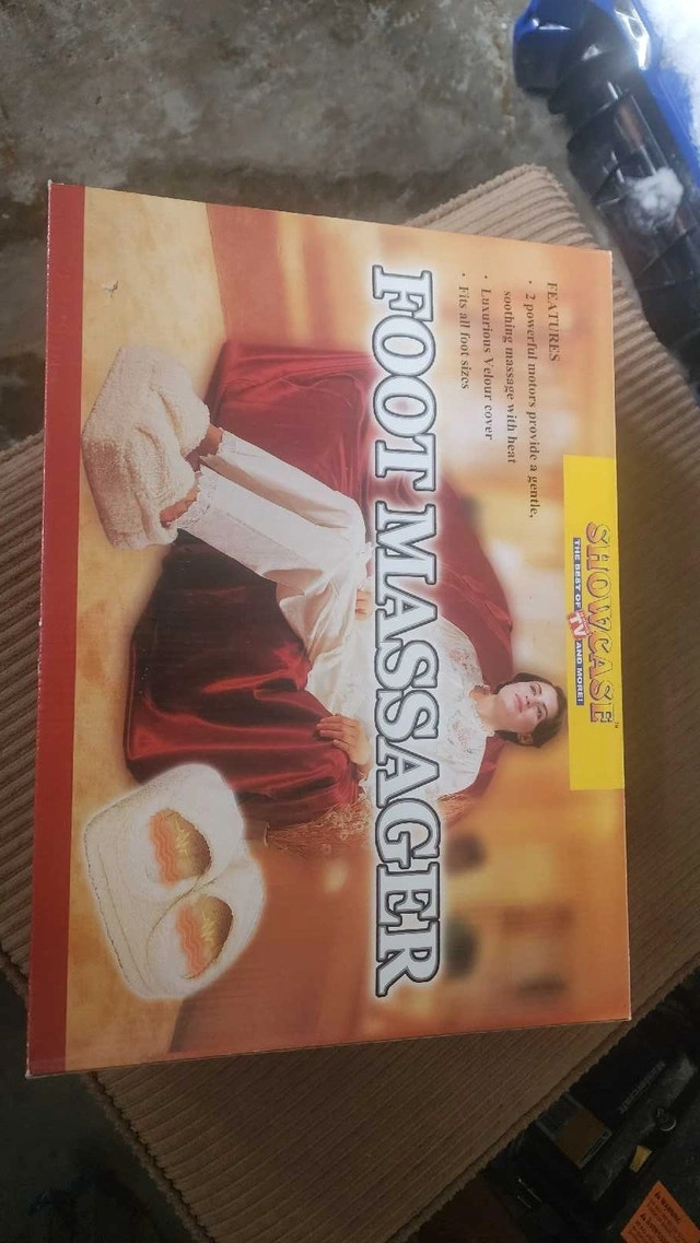 Get ready to pamper your feet with this Showcase Foot Massager, featuring two powerful motors that provide a gentle, soothing massage with heat and a luxurious velour cover, designed to fit all foot sizes. This item is new in the box.