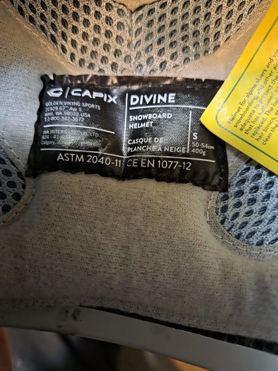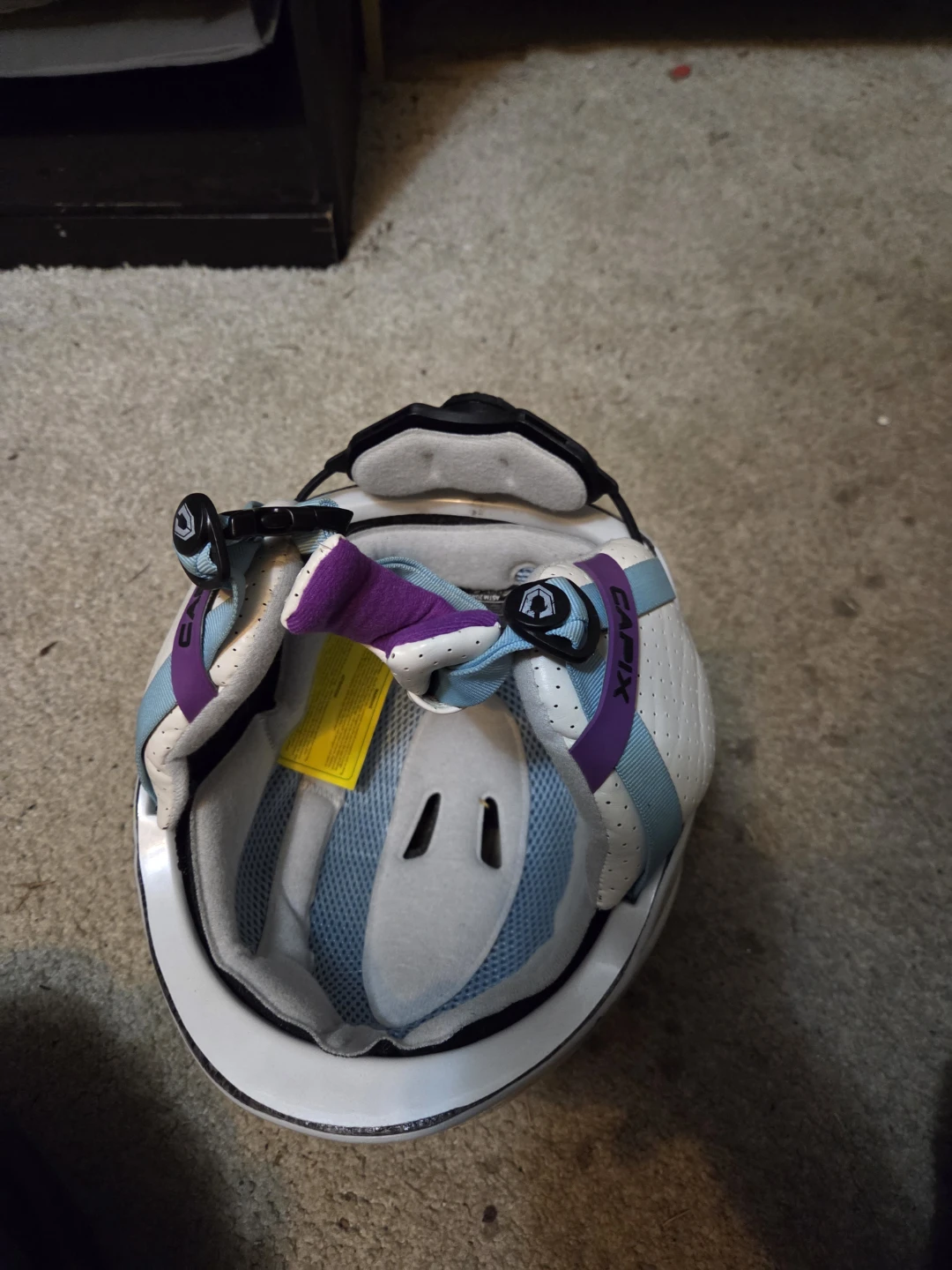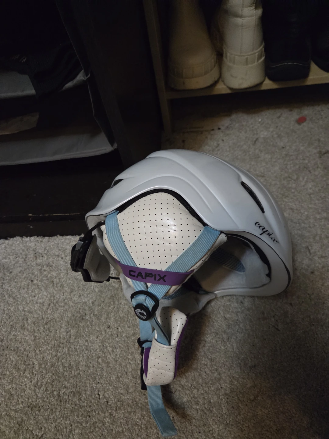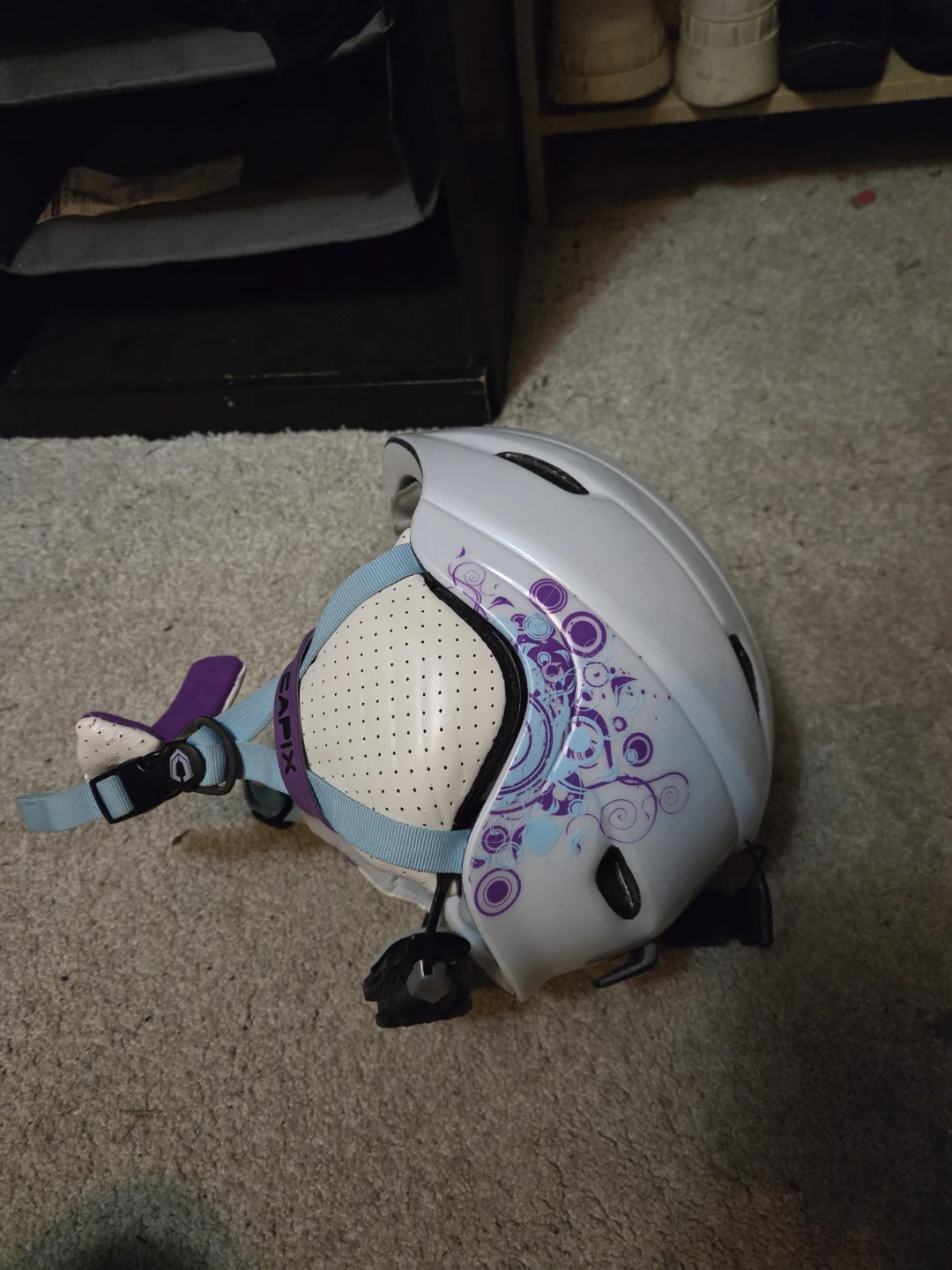 Selling a Capix Divine snowboard ski helmet in size small (50-54cm). It's in great shape and ready for the slopes! The helmet is white with purple and blue accents.