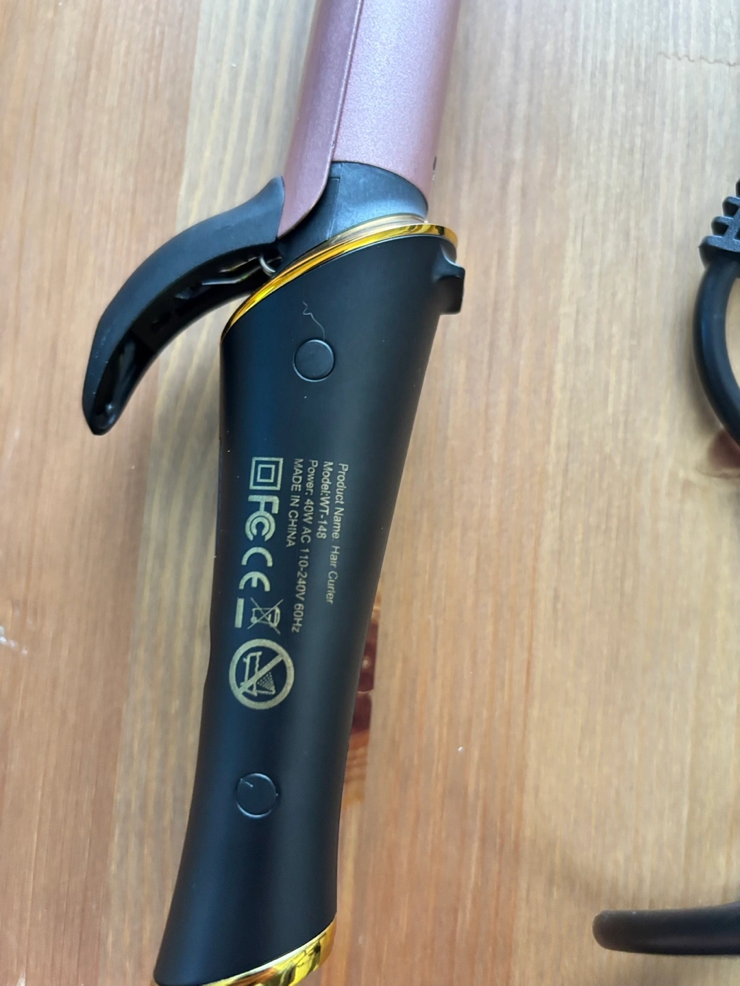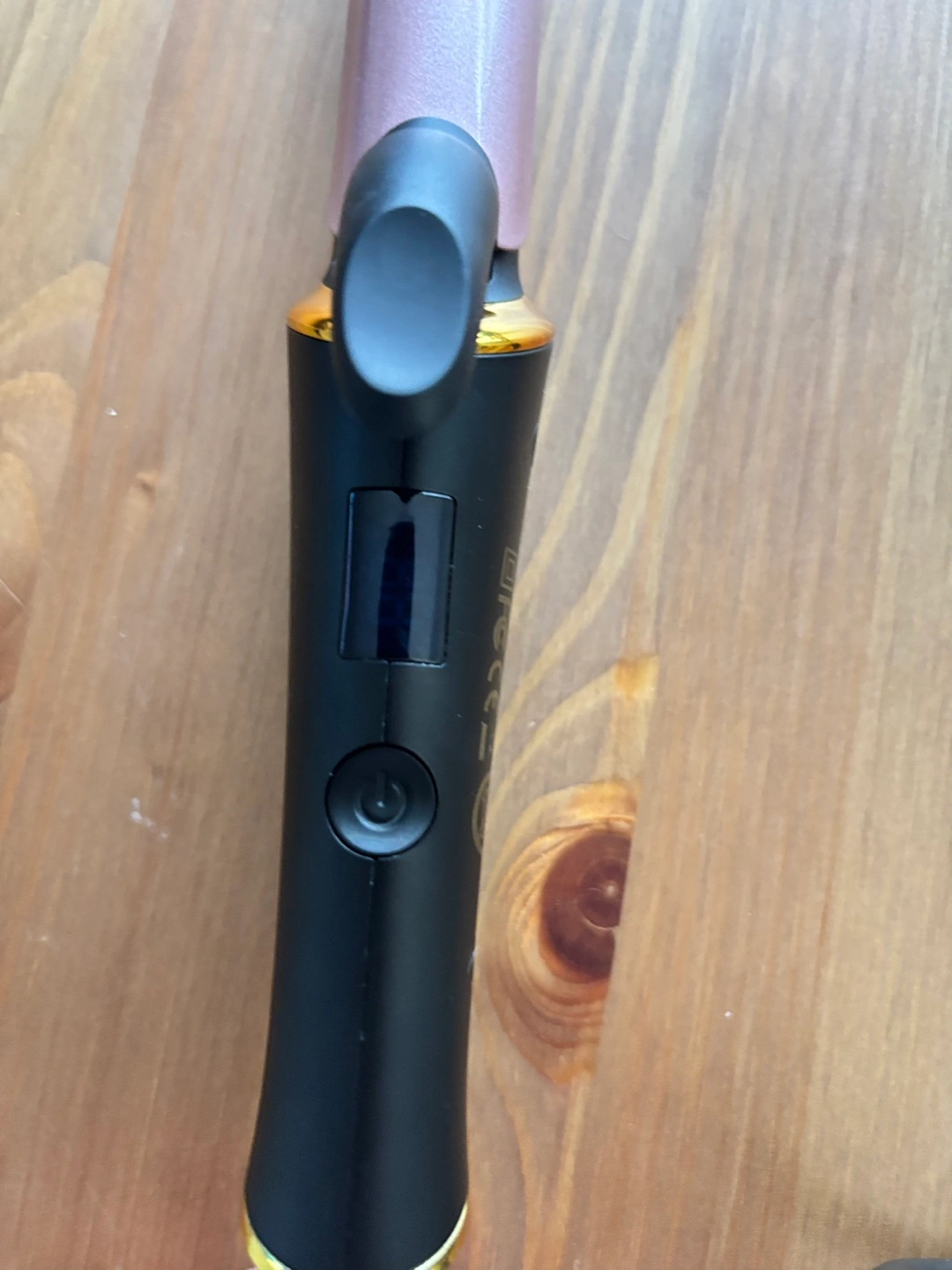 Selling a curling iron with a rose gold barrel and black handle. It comes with a digital display for temperature control and a storage bag. Used once