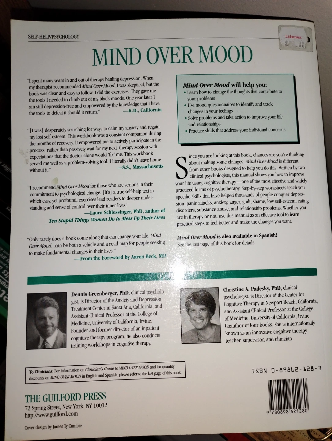Selling the book Mind Over Mood: Change How You Feel by Changing the Way You Think, by Dennis Greenberger and Christine A. Padesky. It's a self-help book that provides tools to improve your life and relationships by changing your thoughts. Perfect for anyone looking to feel better!