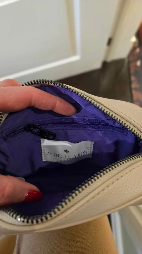 Ela Micro Belt Bag in the color Dove pebble. This is a limited edition item created for the Jillian Harris Spring 2023 Jilly Box. The bag is made from high-quality vegan leather and features a signature purple lining made from 100% recycled plastic bottles.