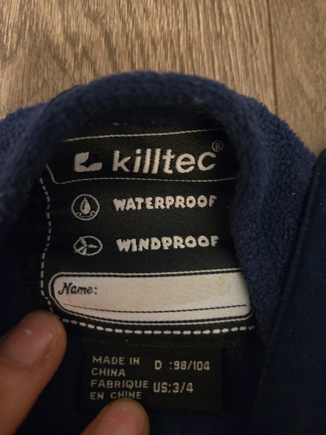 I'm selling a kids' snowsuit from killtec. It's waterproof and windproof, perfect for winter activities. The size is 3/4.