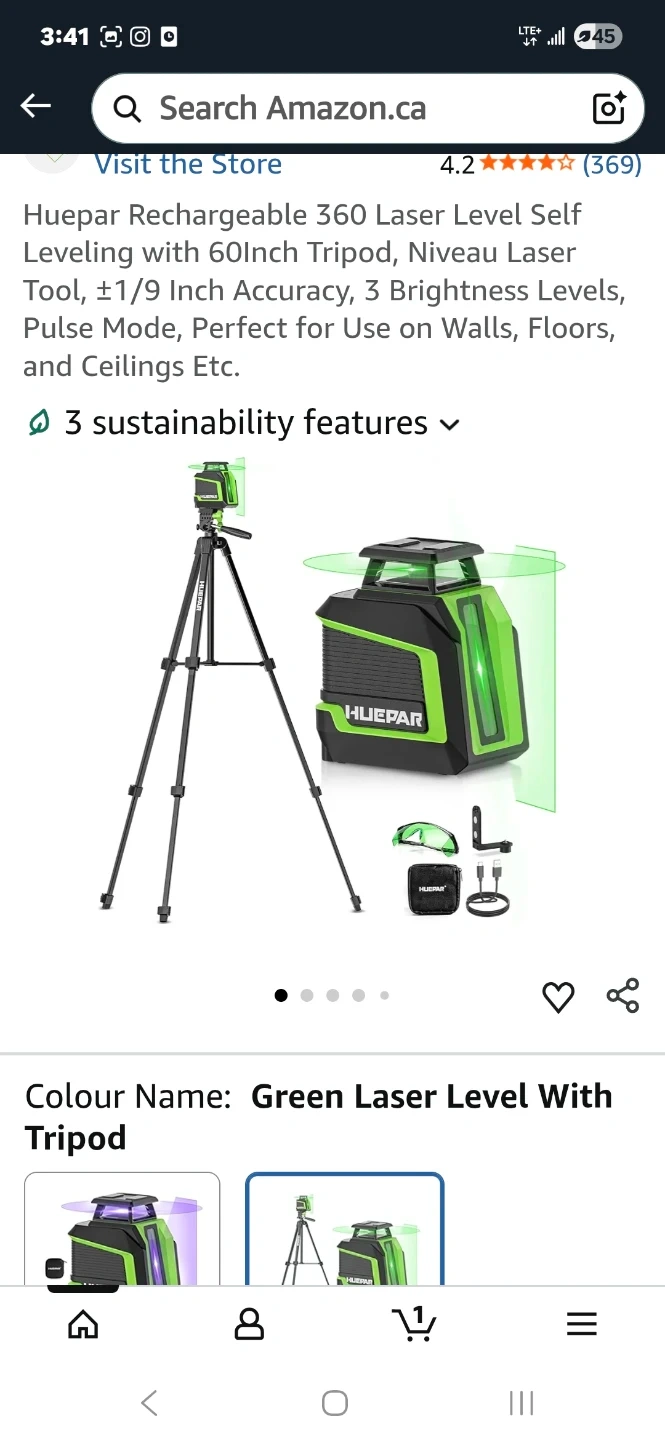 Selling a Huepar rechargeable 360 laser level in green. It comes with the box and all components, including the tripod, user manual, charger, and carrying case. Great for use on walls, floors, and ceilings!