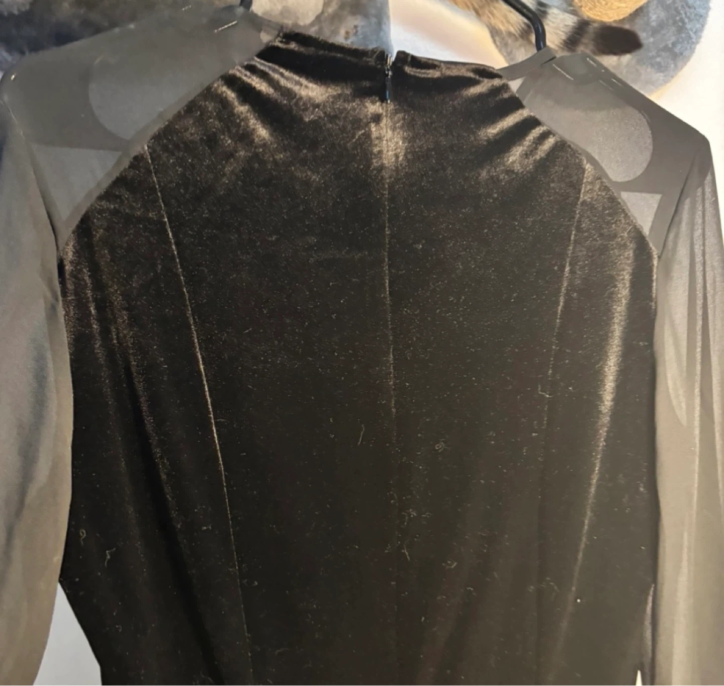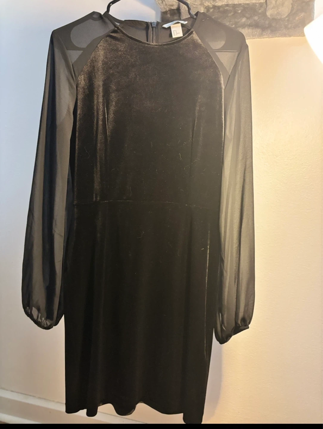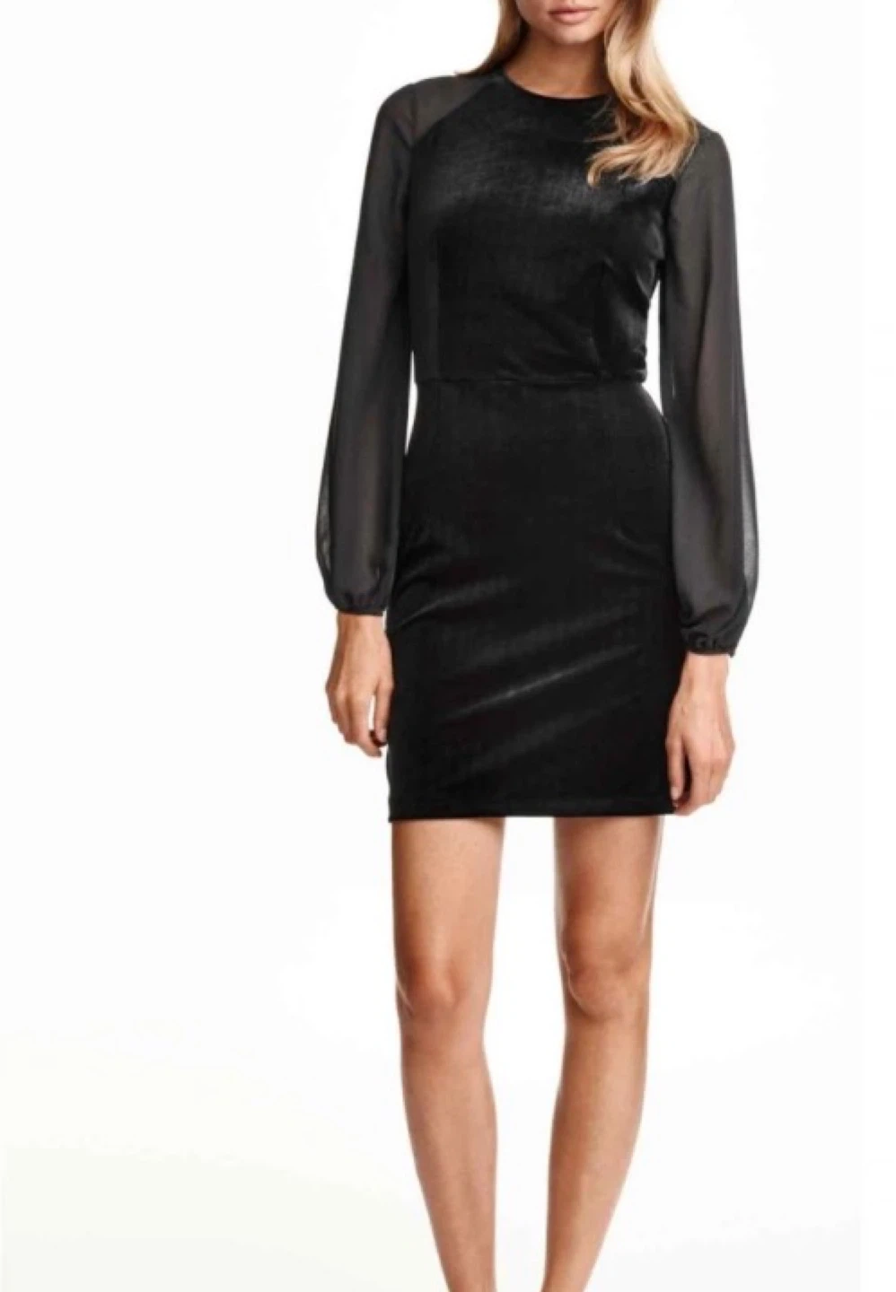 Selling a stylish H&M black velvet dress in size M. It features sheer sleeves and a sleek design, perfect for a night out or special occasion! It's in great condition and ready for a new home