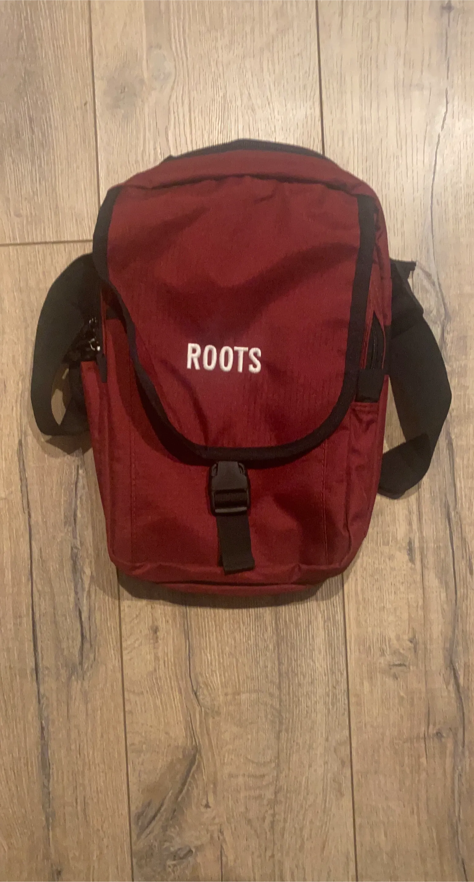 Here's a Roots crossbody bag in a lovely maroon colour! It's perfect for carrying your essentials while keeping your hands free. It has a buckle closure and a zipper pocket on the side.