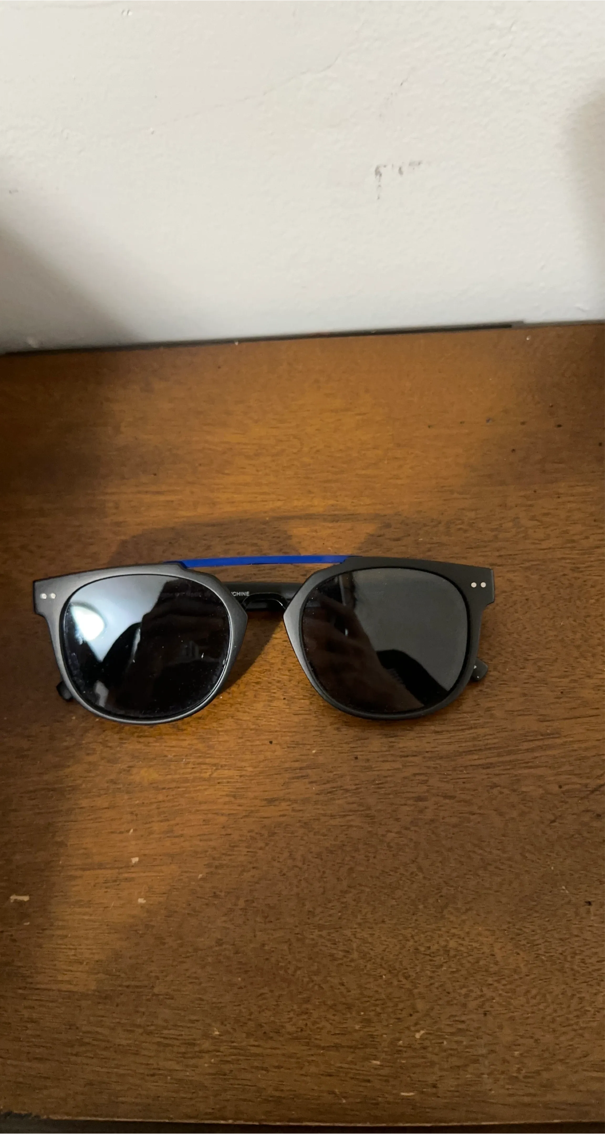 Selling a pair of sunglasses with a black frame and a blue accent stripe on the top. They're in great condition and ready for a new owner!