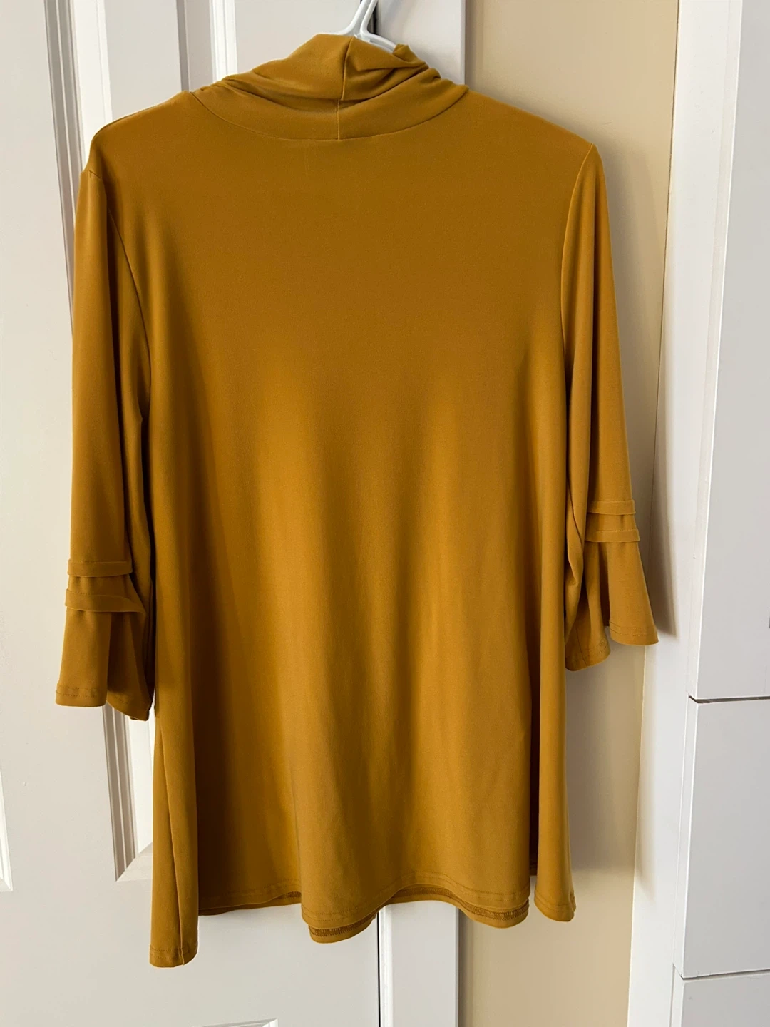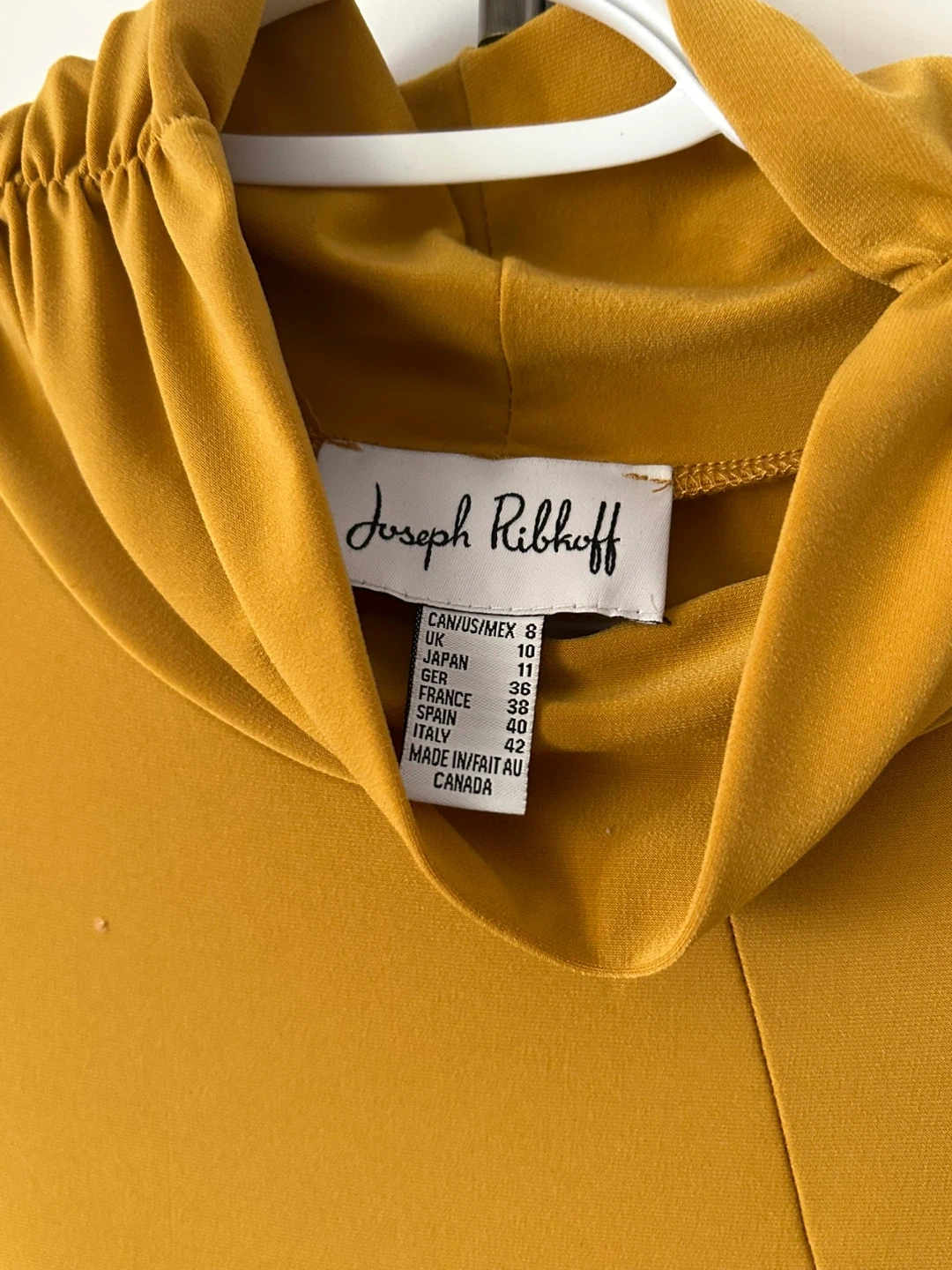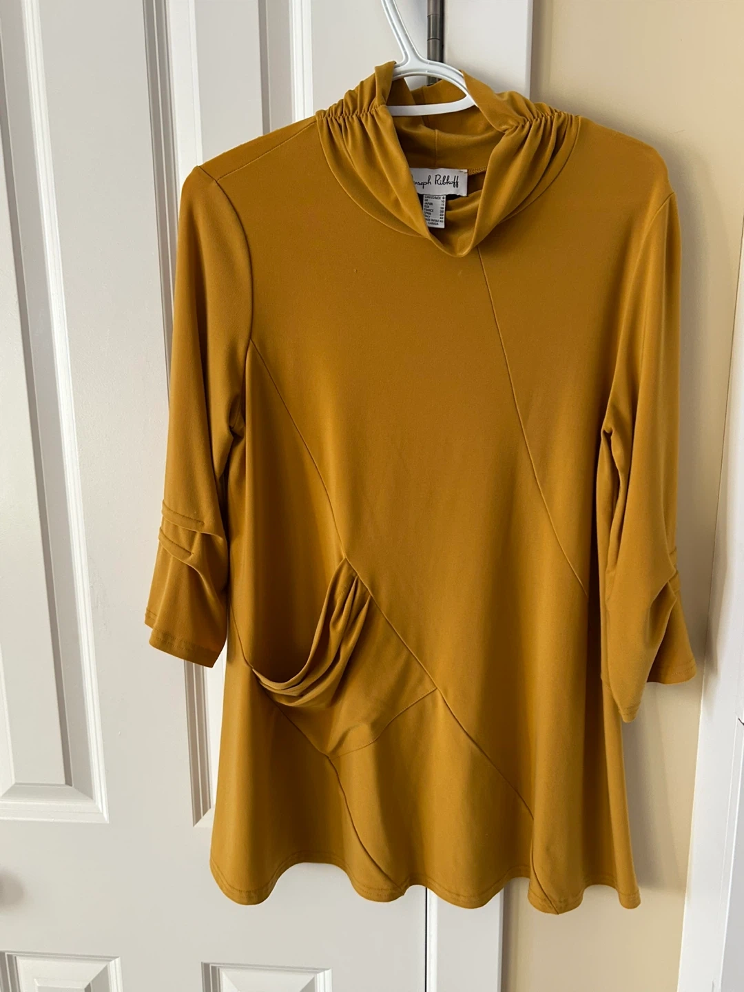 Selling a Joseph Ribkoff tunic top in a lovely gold colour! It's a size 8 and features a unique draped design. Perfect for adding a pop of colour to your wardrobe!
