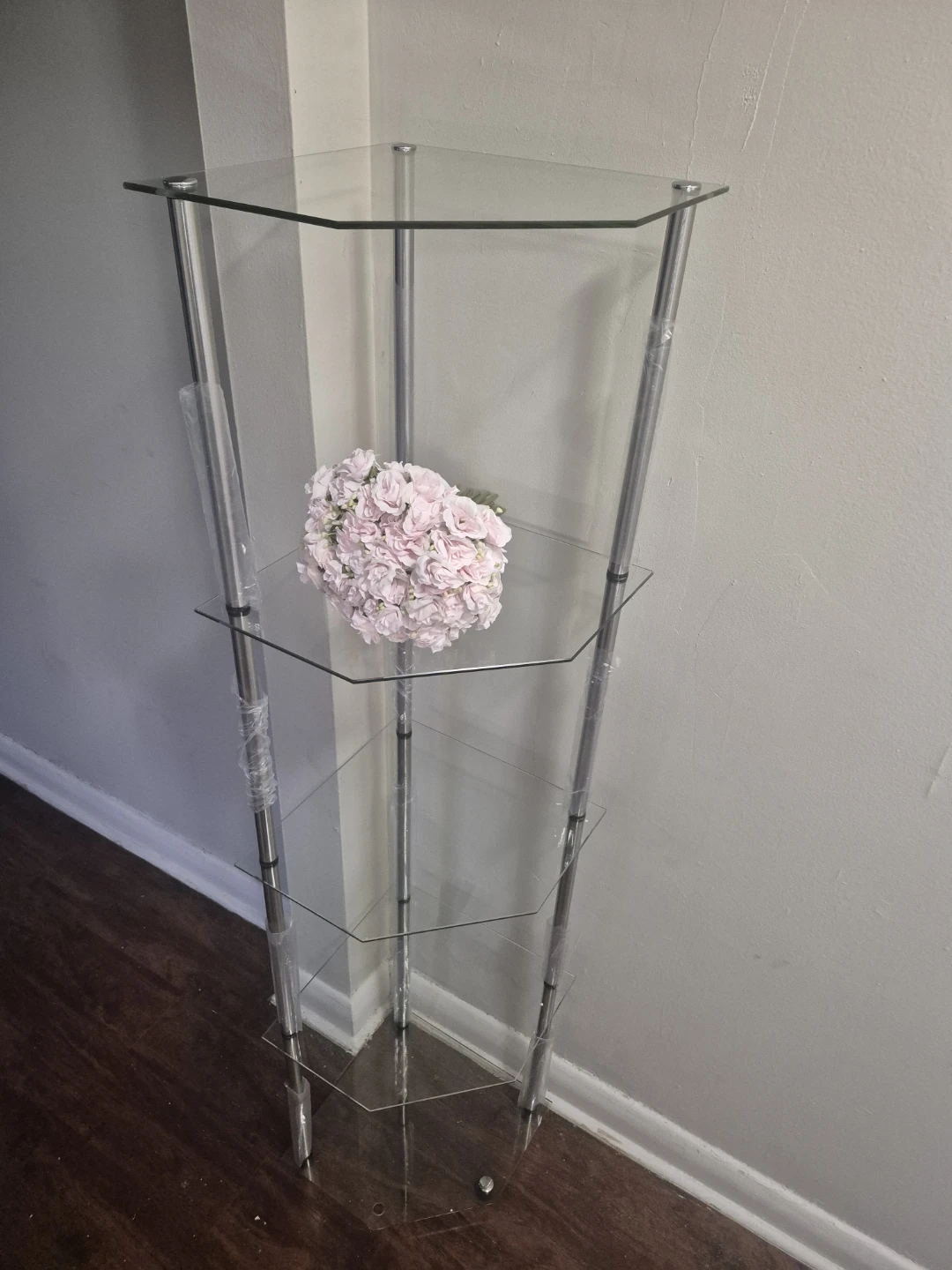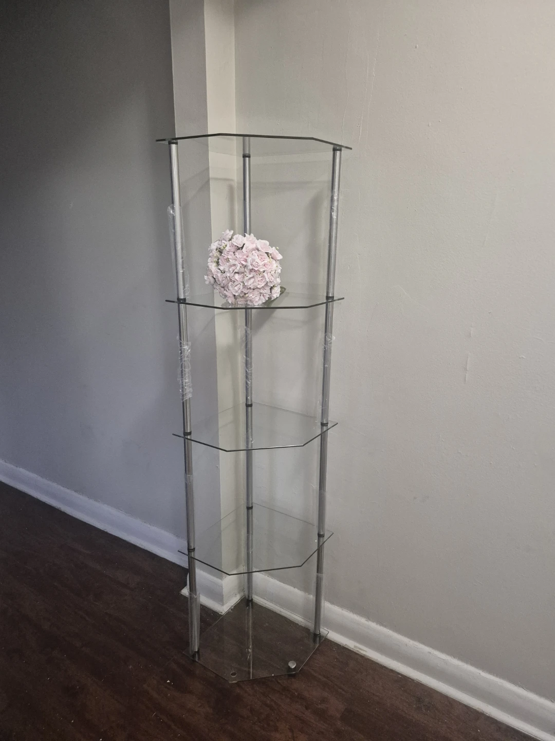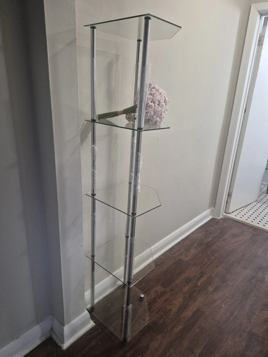 Brand new glass corner shelf with metal frame. Never used at all — I ordered the wrong product, so selling it. ✔ 5-tier tempered glass shelves ✔ Strong metal poles for good support ✔ Modern and elegant design ✔ Perfect for living room, bedroom, bathroom, office, or balcony ✔ Great for plants, décor items, books, perfumes, or showpieces ✔ Fits neatly in any corner and saves space Condition: Brand new (unused) Reason for selling: Ordered wrong item