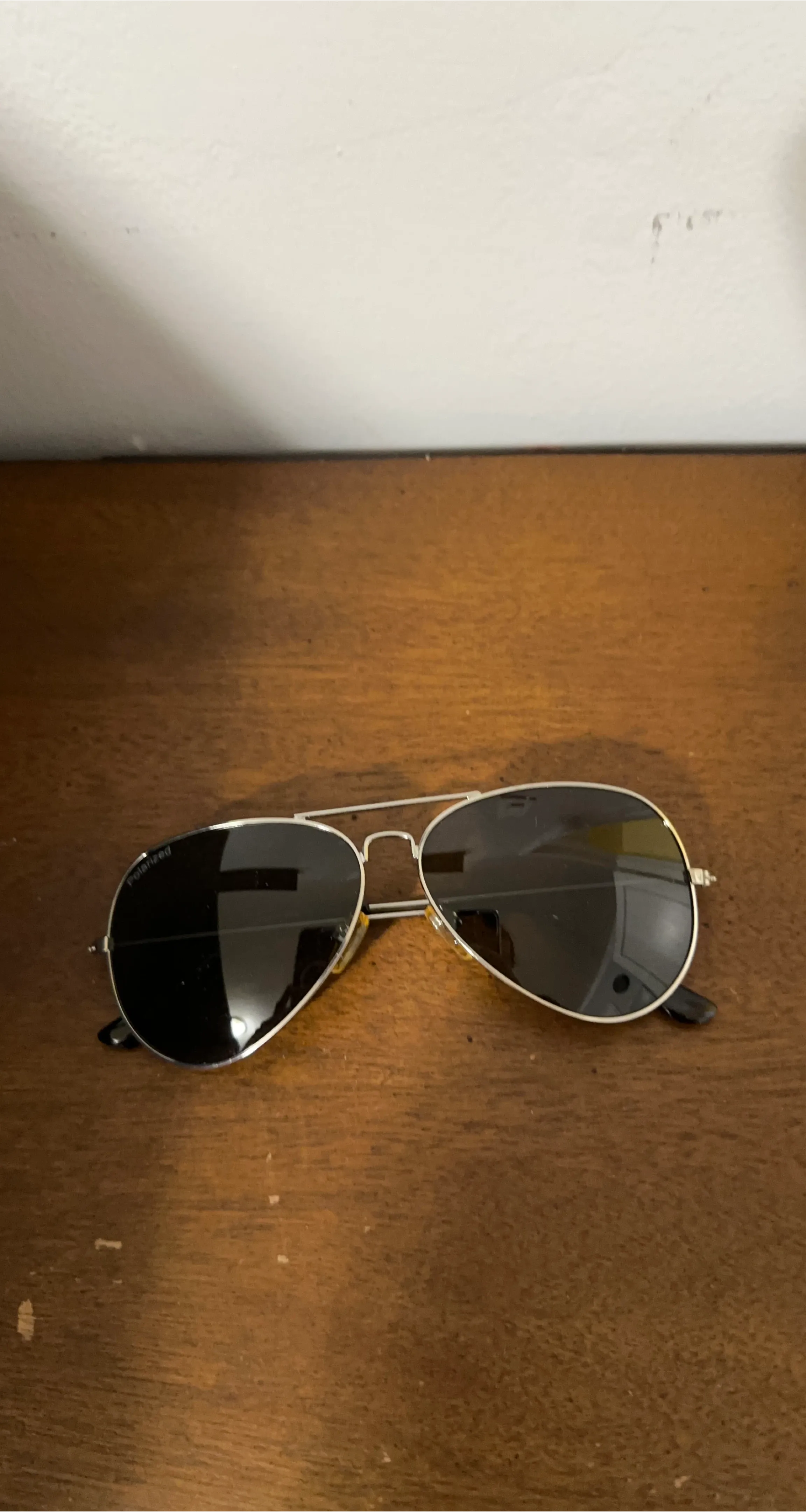 Selling a pair of Polaroid aviator sunglasses with a silver frame. They're in good condition and ready for a new owner!