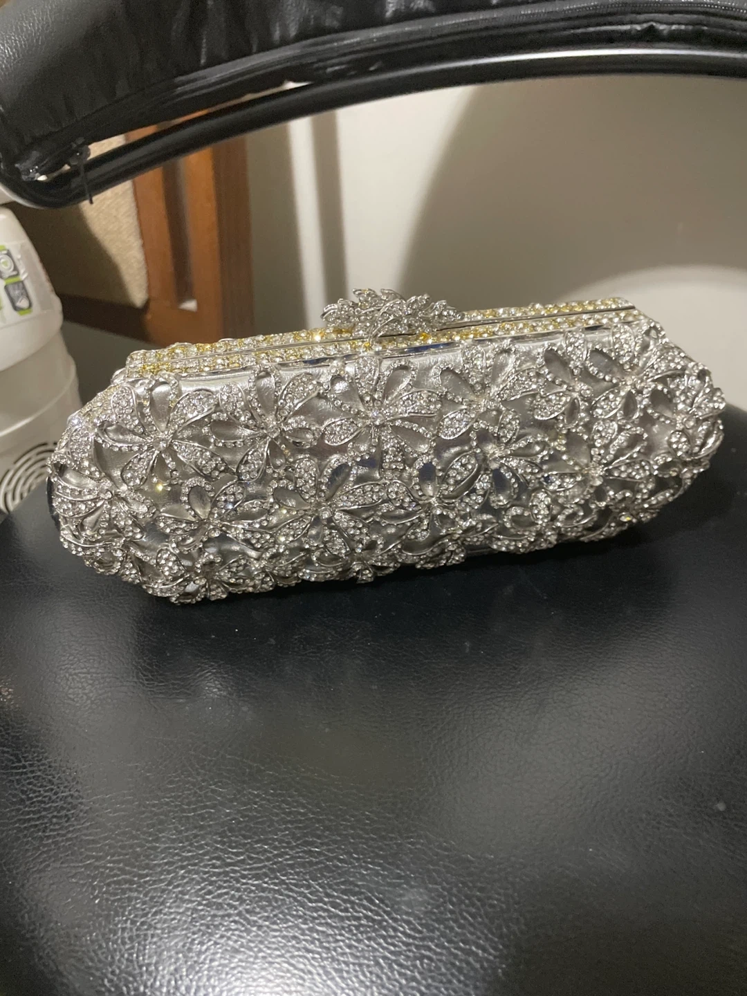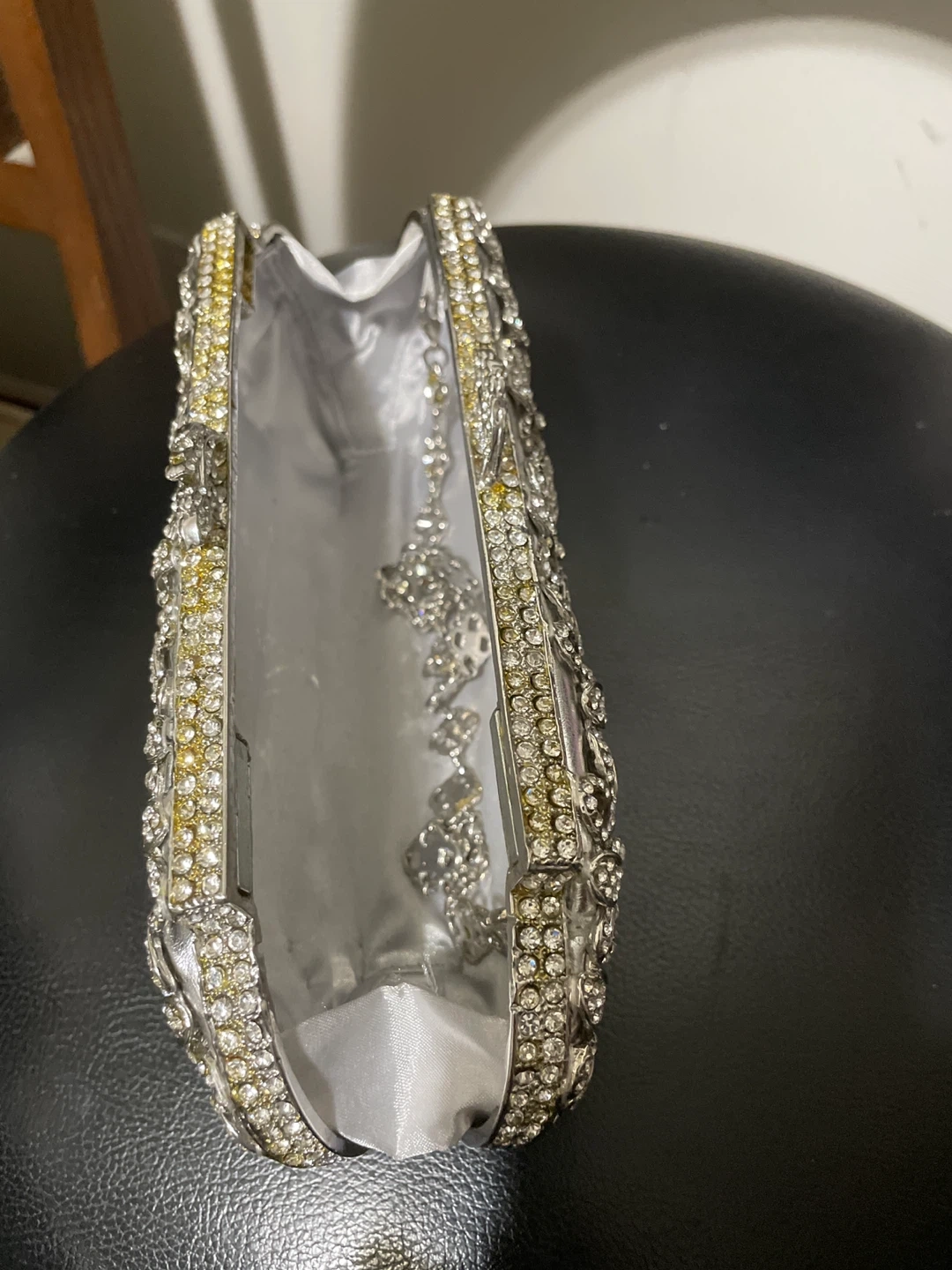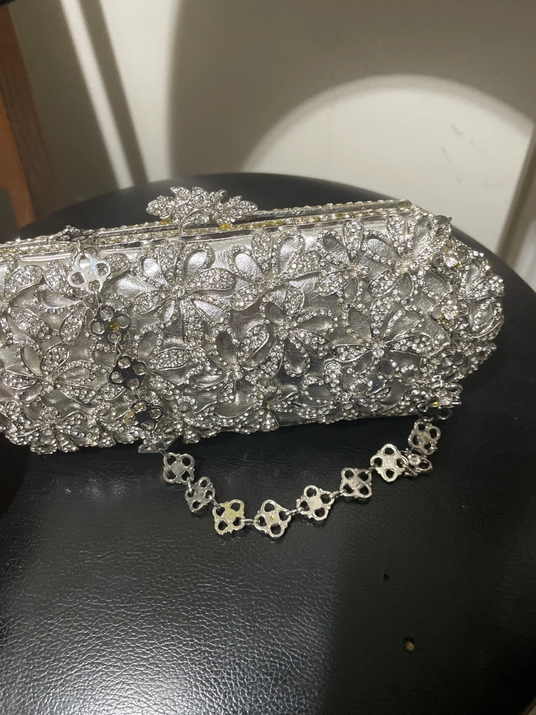 Selling a beautiful silver evening clutch bag. It's adorned with rhinestones and comes with a chain strap. It also comes with its original box! It’s brand new, just been in storage for a while