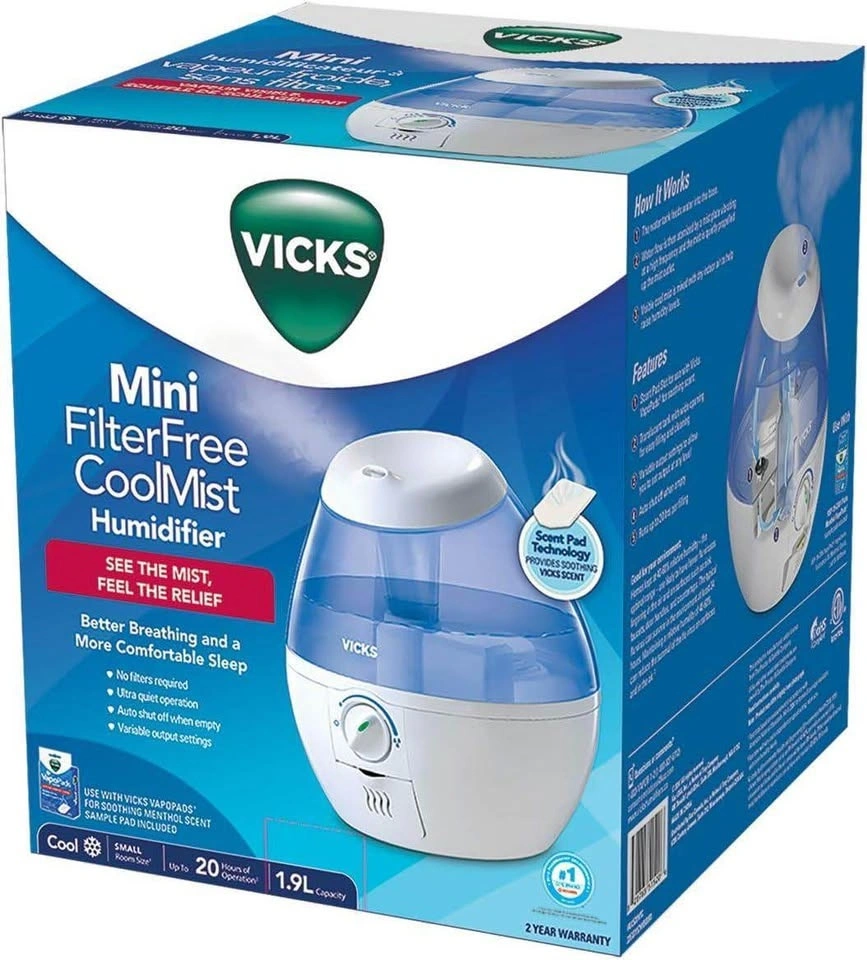 This is a Vicks VUL520WC filter-free ultrasonic cool mist humidifier. It's a mini/small humidifier, great for a baby's room, bedroom, or office desk. It has a 1.9L/0.5Gal capacity.