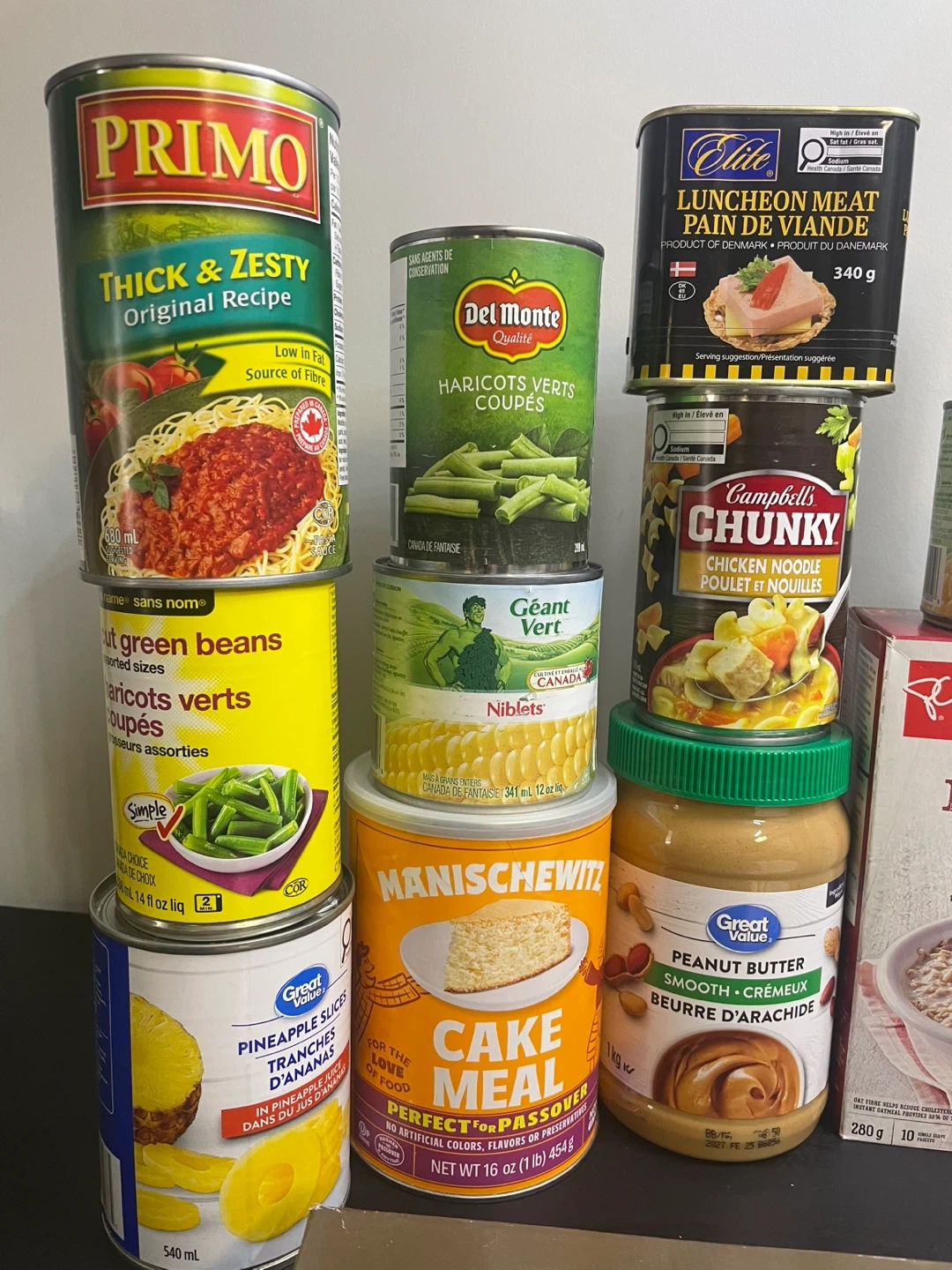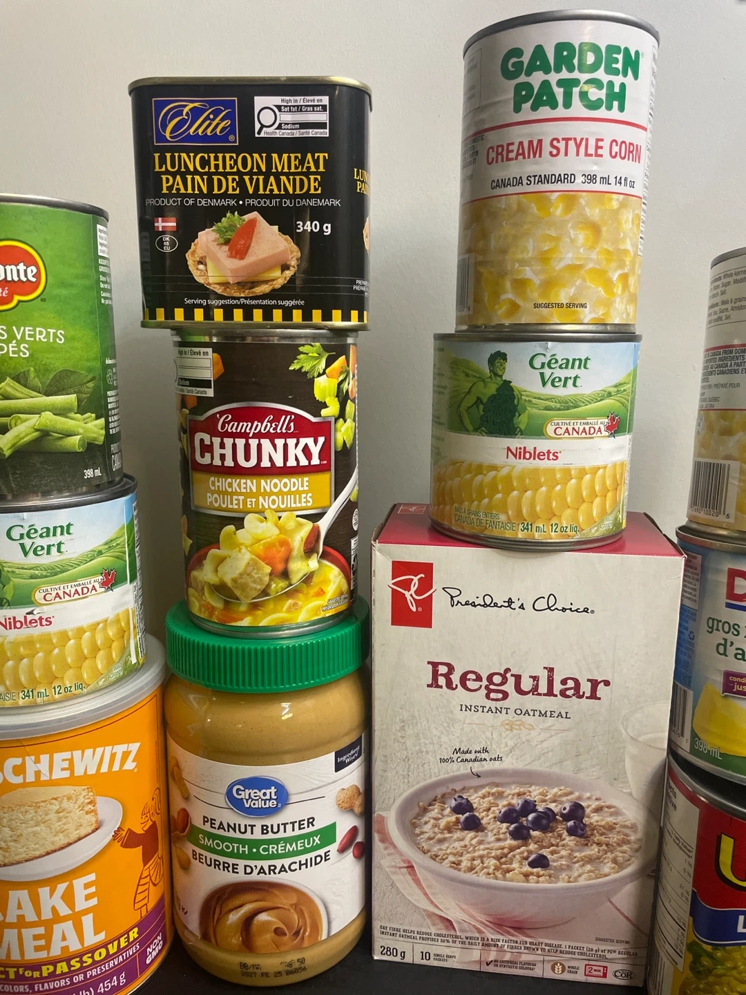 A collection of canned vegetables, soups, pineapple, lunceon meat, and instant oatmeal. Includes items from brands like Primo, Del Monte, Garden Patch, Campbell's, Dole, Unico, Manischewitz, and President's Choice. Great for stocking your pantry!