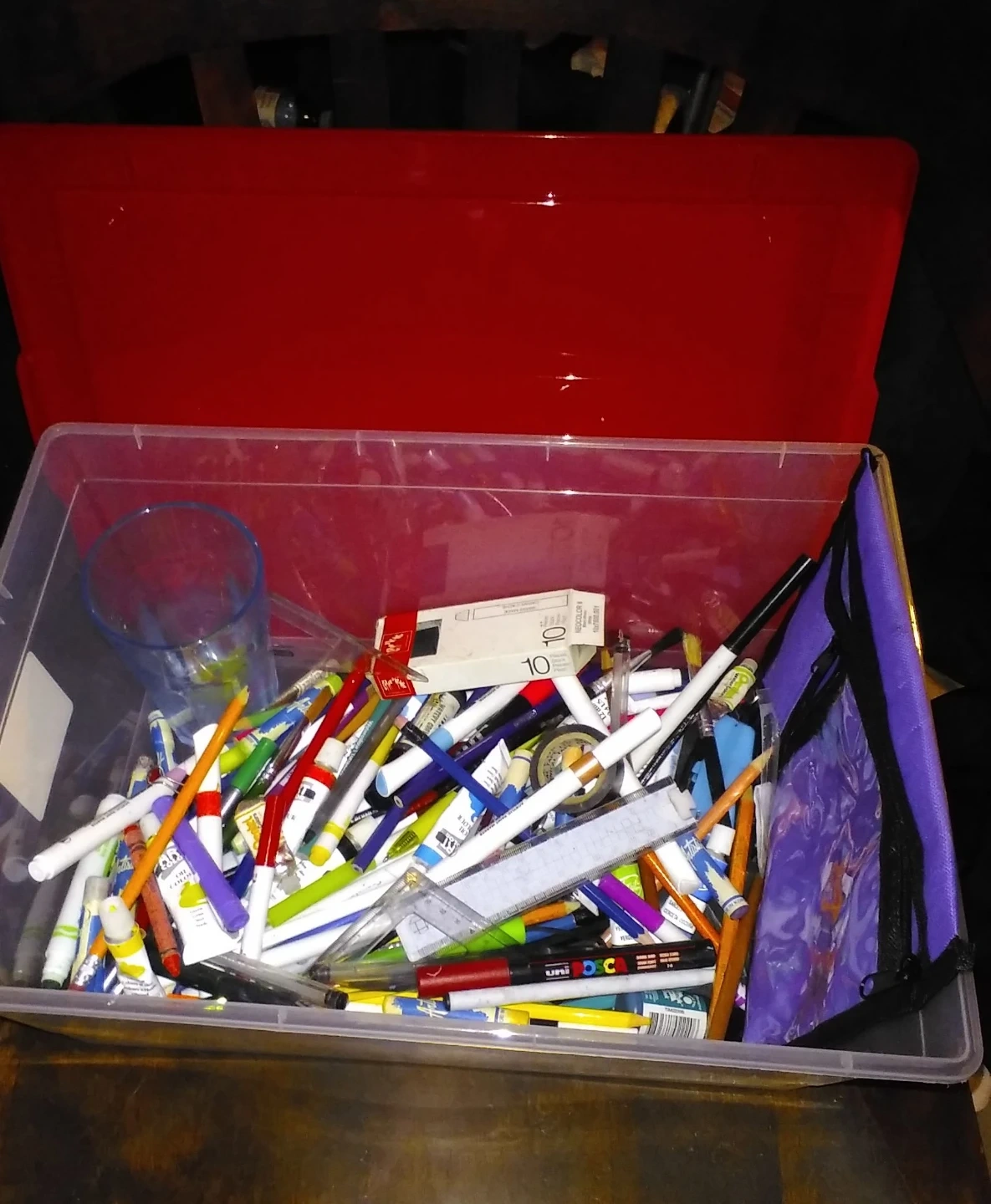 Mixed Art Supplies in Storage Bin
