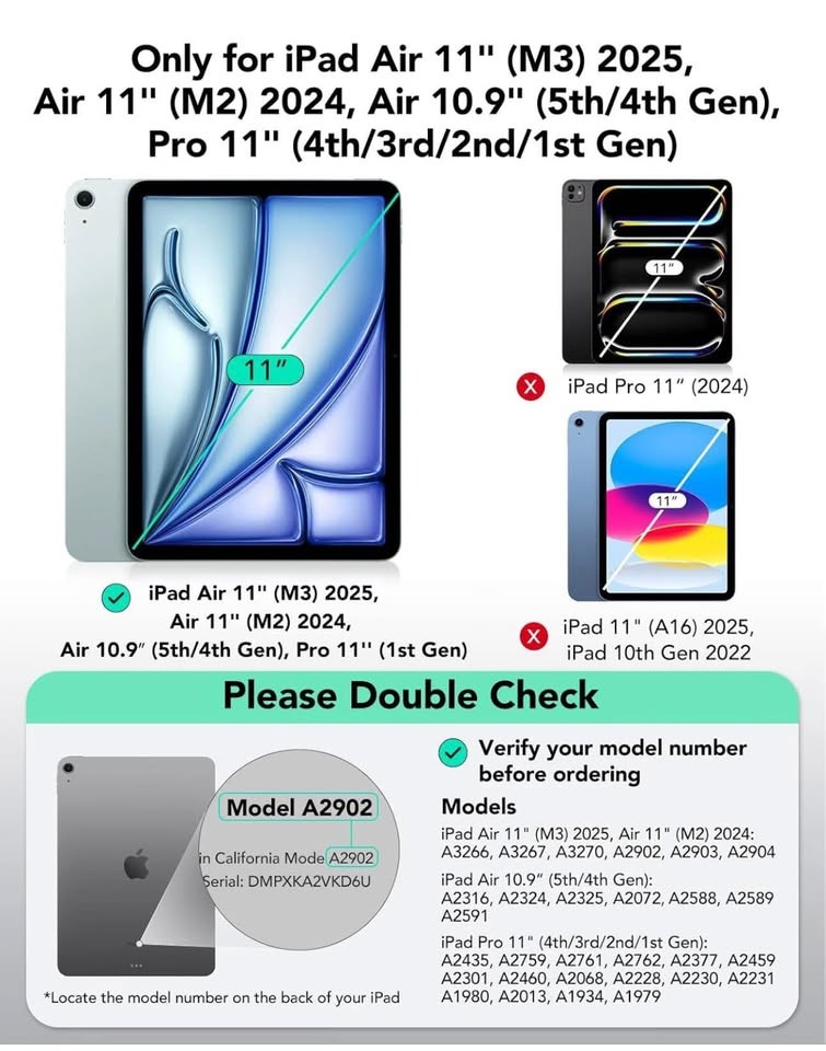 Compatibility: only compatible with iPad Air 11 inch(M3/M2 2025/2024), iPad Pro 11 inch (2022/2021/2020/2018), iPad Air 5th Generation (2022), and iPad Air 4th Generation (2020); models A3266、A3267、A3270、A2902、A2903、A2904、A2588、A2589、A2591、A2316、A2324、A2325、A2072、A2759、A2761、A2435、A2762、A2377、A2459、A2301、A2460、A2228、A2068、A2230、A2231、A1980、A2013、A1934、A1979